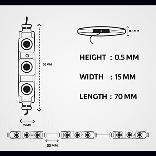 Design: Das LED-Modul besticht durch sein kompaktes, rechteckiges Design mit SMD-LEDs für optimale Helligkeit und einem Abstrahlwinkel von 120° und ist somit ideal für verschiedene Anwendungen. • Konstruktion: Die Vorderseite jedes Moduls ist mit linsenbeschichteten LEDs ausgestattet, die das Licht bündeln und so eine helle und gleichmäßige Lichtleistung erzeugen, die die Sichtbarkeit verbessert und Blendung reduziert. • Merkmale: Jedes Modul verfügt über LEDs mit hoher Lumenzahl, die für eine helle und gleichmäßige Beleuchtung sorgen. Der Transformator bietet ein hohes Maß an Schutz und verbraucht im Vergleich zu herkömmlichen Leuchten sehr wenig Strom. • Wasserdicht nach IP65: LED-Module mit Schutzklasse IP65 sind wasser- und staubdicht, für den Innen- und Außenbereich geeignet, geben nur minimale Wärme ab und sind sicher in engen Räumen. • Anwendung: Vielseitige, energieeffiziente LED-Module, ideal für Beschilderungen, Displays, Wohnkultur und den Außenbereich. Langlebig und benutzerfreundlich, eignen sie sich sowohl für professionelle als auch für private Projekte. • Abmessungen: Jedes Modul misst 70 mm (L) × 15 mm (B) × 0,5 mm (H) bei einem Modulabstand von 50 mm. Packungsinhalt: 1 × 20 vorverdrahtete LED-Modul-Lichterketten (3 LEDs pro Modul)