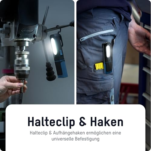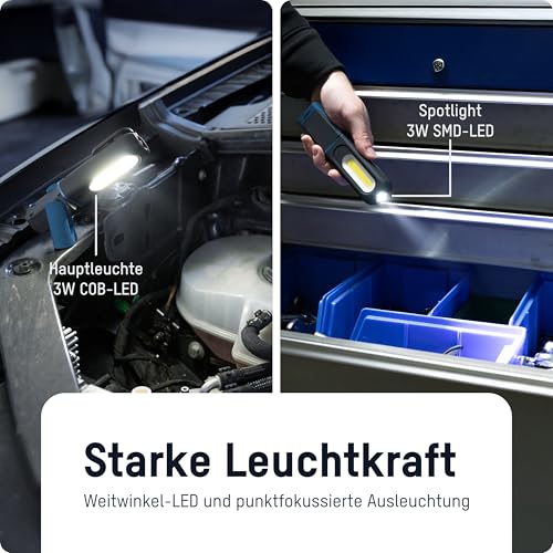 Leuchtstark: Mit einer Helligkeit von 350 Lumen und einer bis zu 7 stündigen Leuchtdauer ist die wiederaufladbare LED Arbeitsleuchte ideal für die Arbeit in der Werkstatt, am KFZ und beim campen. • Robust & stoßfest: Die Arbeitslampe ist Spritwassergeschützt, hat ein robustes Kunststoffgehäuse und ein schlankes Design. Dadurch kann die kleine Taschenlampe vielseitig eingesetzt werden. • Einstellbar: Mit dem Haltemagnet an der Unterseite kann die Werkstattleuchte einfach befestigt werden. Außerdem hat die Lampe ein um 360° drehbares Gelenk und einen 180° neigbaren Standfuß. • Aufladbar: Durch das mitgelieferte USB-Kabel kann die LED Leuchte einfach über die Typ-C Ladebuchse aufgeladen werden. Die Ladekontrollanzeige informiert zuverlässig über den Ladezustand. • Lieferumfang: LED Arbeitsleuchte, USB Typ-C Kabel