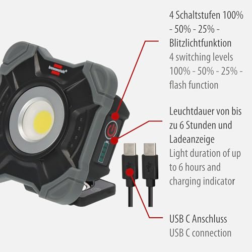 Kleine, kompakte LED Leuchte mit Kantenschutz und Gehäuse aus hochwertigem, robustem und schlagfestem Kunststoff – ideal für Baustelle, Werkstatt, Haus, Garten, Camping, diverse Outdoor-Aktivitäten • Superhelle LED Arbeitsleuchte mit 4 Schaltstufen 100% – 50% – 25% – Flash Light-Funktion und einer Leuchtdauer von bis zu 6h und Ladeanzeige – LED Strahler im praktischen Taschenformat mit 1000lm, 6500K • Extrem kompakter LED Arbeitsstrahler IP54 (staub- und spritzwassergeschützt) mit Karabinerring und Magnet an der Rückseite für ein angenehmes und ergonomisches Halten und eine flexible Befestigung • Handliche LED Campingleuchte mit ausklappbarem Haltebügel zum Aufstellen oder praktischem Befestigen – ideal für den vielfältigen Einsatz im Handwerk, aber auch im Haus, Garten, oder beim Camping • Die extrem handliche LED Campinglampe mit 1000lm kann dank integriertem Akku (Li-Ion-Akku 3,7V/2,2Ah mit Ladeanzeige) ganz einfach über das mitgelieferte 1m USB C auf USB C Ladekabel aufgeladen werden