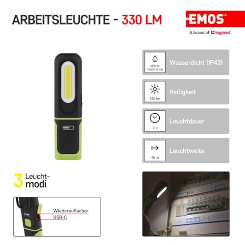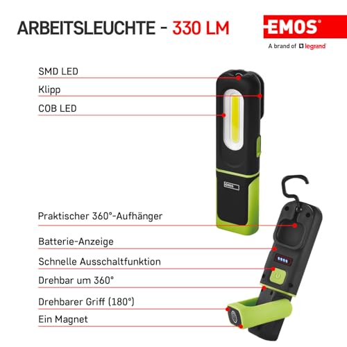 EMOS – aufladbare LED-Arbeitsleuchte – Magnetfuß, Haken, verstellbar – stoßbeständig, wasserdicht – 300lm, max. 45m – 3 Leuchtmodi – 7 Stunden – USB-Kabel – IP43 für Außenbereich – schwarz-grün