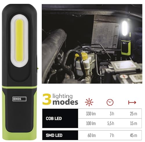 PRAKTISCH UND LEISTUNGSSTARK: Das Arbeitslicht hat dank der COB-LED/SMD-LED-Technologie eine Helligkeit von bis zu 300lm und eine Leuchtweite von bis zu 45m. Es gibt 3 unterschiedliche Leuchtmodi: COB LED 100%, COB LED 50%, SMD LED. (EMOS P4537) • BIS ZU 7 STUNDEN: Die LED-Arbeitslampe leuchtet je nach Modus 3 bis 7 Stunden lang. Der integrierte Li-Ion-Akku (1200mAh) ist wiederaufladbar. Inklusive USB-Kabel, LED-Ladestandsanzeige, Überladungs- und Tiefendladungsschutz. • PRAKTISCHE HANDHABUNG UND SCHNELLES AUSSCHALTEN: Mehrere Befestigungsmöglichkeiten durch drehbaren Aufhänge-Haken, verstellbaren Magnetfuß und einen Clip. Ausschaltbar durch die schnelle Ausschaltfunktion mit nur einem Tastendruck. • STOSSBESTÄNDIG UND WASSERDICHT: Die Arbeitsleuchte ist dank Schutzart IP43 geeignet zum Einsatz in Werkstatt, Garten, Garage, bei Reparatur, Auto-Reparatur, Inspektion, im Notfall, und auch beim Camping. • MAKING LIFE EASY: EMOS, eine Marke von Legrand, bietet hochwertige Elektroprodukte zu erschwinglichen Preisen für den privaten und gewerblichen Gebrauch. Jedes unserer Produkte wird in unserem Labor sorgfältig auf Qualität und Leistung geprüft.