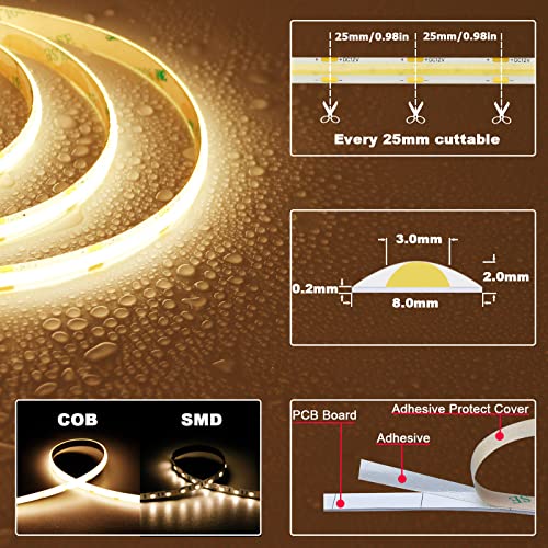 TOPAI COB LED Streifen 5M Warmweiss Wasserdicht IP65, 12V LED Strip 3000K Aussenbereich, Dimmbar CRI>90 Sehr Hell 4000lm LED Band Selbstklebend, 480LEDs/M Flexible Schneidbar (Nur der Streifen)