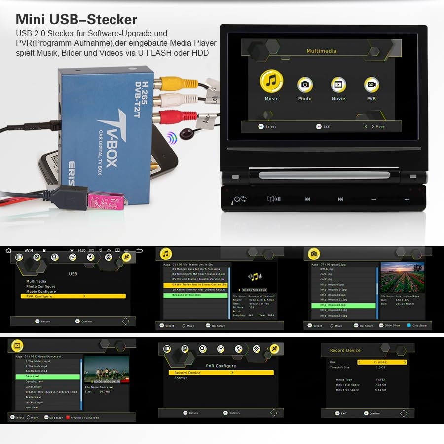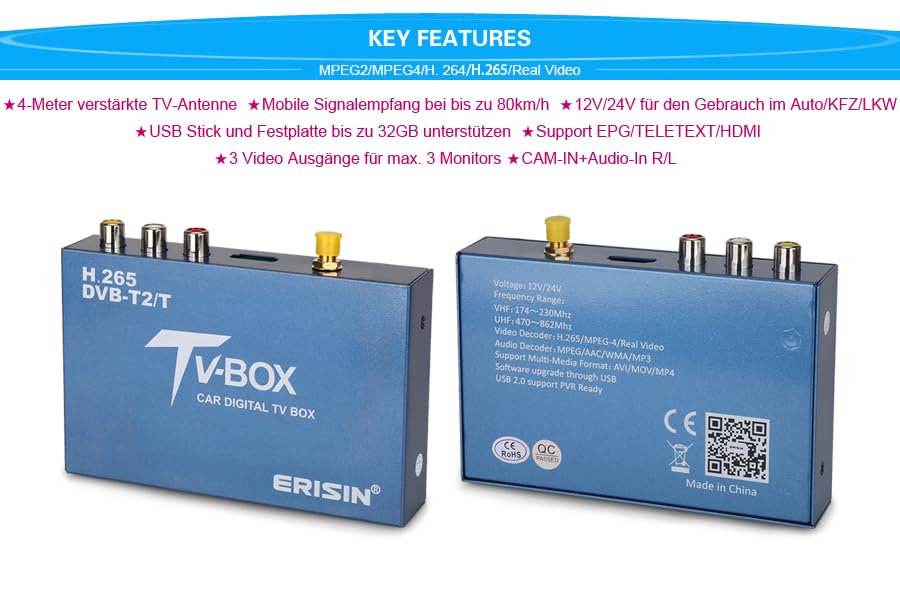 【Hauptmerkmale】Vollständig mit DVB-T EN300 744 / DVB-T2 EN302 755 Standard übereinstimmen. Dank der verstärkten High-Gain Antennen, so kann das Gerät die Signalen bei bis 80km/h empfangen. Dank Infrarot-Auge für die Fernbedienung mit 2m Kabel, so kann man den Receiver auch versteckt einbauen, z.B. im Handschuhfach oder im Fußraum des Beifahrers. Sie können auch das laufende TV-Programm aufzeichnen. Hierzu wird nur ein USB-Stick oder eine USB-Festplatte(bis 32GB) als Speichermedium benötigt. • 【Spezifikation】- 12V/24V Betrieb – Speziell für den Gebrauch im Auto/KFZ/LKW – 1 verstärkte High-Gain TV-Antennen im Lieferumfang enthalten, Signalempfang bei bis 80km/h. – Unterstützt HEVC (H.265), H.264, MPEG-2, MPEG-4 solche Video Decoder (bis zu 1920x1080P) – Unterstützt PCM, AAC Leve12, ACC Leve14 solche Audio Decoder – Unterstützt Multi-Media Format: MPG, MKV, AVI, MOV, WMA, MP4, MP3, AAC • 【Spezifikation】- Unterstützt schnelle Hardware-Dekodierung von JPEG-Bild – DVB Untertitel ETSI 300473 gefällig und OSD TELETEXT unterstützen, was kann Videotextes für Infos Ihrer Lieblingssender anzeigen – Menü/Audio/OSD Sprachen: Englisch/Französisch/Deutsch/Italienisch/Spanisch/Portugiesisch/Russisch… – Der Elektronischer Programmführer (EPG) ermöglicht eine Programmvorschau und Videotext für heute, morgen und den Siebenten Tags. – Automatischer/Manueller Suchlauf unterstuetzen • 【Spezifikation】- Mini USB-Anschluss für Software-Upgrade und PVR(Programm-Aufnahme) – Der eingebaute Media-Player spielt Musik, Bilder und Videos via U-FLASH oder HDD – Unterstützt USB Stick oder Festplatte bis zu 32GB – Standard AV-Anschluss für AV-Eingang und AV-Ausgang, hier sollen Sie eine Adapter-Kabel extern kaufen – 3 RCA Videoausgänge für den Anschluss 3er Monitore gleichzeitig – RCA Audio Eingänge R/L, RCA Audio Ausgänge R/L – HDMI-Schnittstelle garantieren ein kristallklares Bild – Standby-Verbrauch von weniger als 0.85 W (True Standby) • 【 Lieferumfang】-1 * Mobile DVB-T2/T Empfänger -1 * Handbuch auf Englisch -1 * Fernbedienung (Ohne Akk.) -1 * Stromkabel (1.5m) -1 * Externe IR Empfänger (2m) -1 * Digital TV Antennen mit Verstärker (4m) -1 * RCA Anschlusskabel (2m)