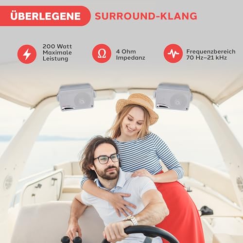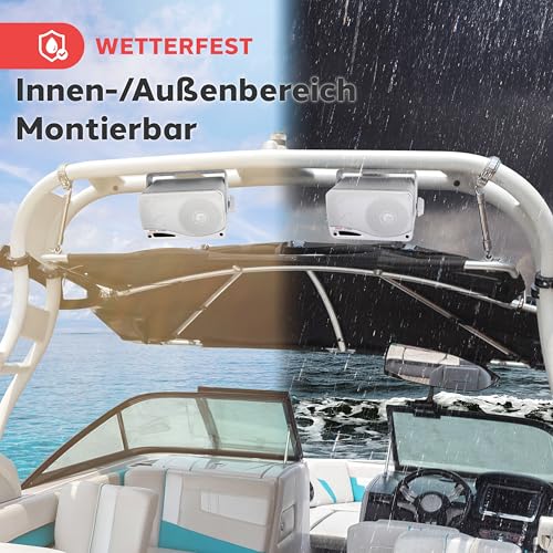 KOMPAKTES UND WETTERFESTES DESIGN – Perfekt geeignet für den Außenbereich, wie Terrassen, Boote oder Pools. Diese Mini Lautsprecher und Lautsprecher Boxen sind ideal für jedes Wetter. • KLARER UND VIELSEITIGER SOUND – Mit einem 8,89 cm Tieftöner und einem 2,54 cm Super-Dome-Hochtöner liefern diese Musikboxen und Speaker mit klaren Klang – 3 Wege Lautsprecher perfekt für Zuhause, Outdoor oder als Sauna Lautsprecher. • LEISTUNGSSTARK UND PASSIV – Diese Lautsprecher Boxen sind passiv und bieten eine maximale Leistung von 200 Watt. Ideal für den Einsatz als Lautsprecher Box oder für den Betrieb mit einem Verstärker. • ROBUST UND WASSERDICHT – Der wasserdichte Lautsprecher mit robustem ABS-Gehäuse ist perfekt für den Outdoor-Einsatz. Verwenden Sie ihn als Outdoor Box wasserdicht oder Duschlautsprecher Bluetooth. • EINFACHE INSTALLATION UND VIELSEITIG – Mit dem mitgelieferten Montageset lässt sich diese Mini Musikbox oder Outdoor Lautsprecher Bluetooth schnell installieren. Maße: 13,34 cm Breite, 9,53 cm Höhe, 9,53 cm Tiefe.