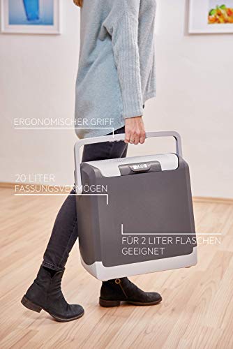 Thermoelektrische Kühlbox mit doppelter Belüftung für schnellere Kälteverteilung • Keine Kühl-Akkus erforderlich, da die Kühlbox elektrisch betrieben wird • Ideal für Auto, Camping, Büro und unterwegs • Fassungsvermögen von 20 Litern (geeignet für zwei stehende 2 Liter Flaschen) • Zuverlässige Kühlung bis zu 20 °C unter Umgebungstemperatur • Integriertes Kabelfach für einfaches Verstauen der Anschlüsse, Maße: 42,5cm (B) x 42,5cm (H) x 30,8cm (T) • Mit 12 V Kfz-Anschluss und 230 V Anschluss für zu Hause, FCKW-frei