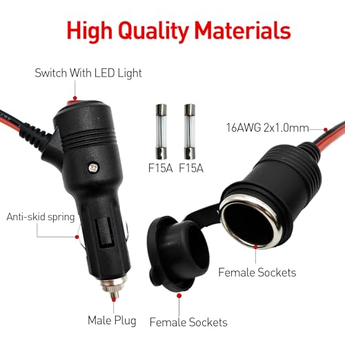 【 Praktischer Ein-/Ausschalter】 Mit integriertem Schalter und roter Kontrollleuchte für einfache Bedienung – kein ständiges Ein- und Ausstecken mehr nötig. Die praktische Schalterfunktion ermöglicht komfortables Ein- und Ausschalten direkt am Kabel, ideal für dauerhafte Installationen im Fahrzeug. • 【Starke Leistung & Zuverlässigkeit】 Mit hochwertigen Kupferleitern und einer robusten Sicherung bietet das Kabel eine stabile und zuverlässige Stromversorgung auch bei hoher Belastung. Die Konstruktion gewährleistet optimale Leistungsübertragung für 12V/24V-Systeme in allen Fahrzeugtypen. • 【Umfassender Schutz & Langlebigkeit】 Wasserdichte Stecker, überlastgeschützte Sicherung und temperaturbeständiges PVC-Material gewährleisten maximale Sicherheit unter allen Bedingungen. Die doppelte Isolierung schützt zuverlässig vor Feuchtigkeit und mechanischen Beschädigungen. • 【Vielseitige Anwendungsmöglichkeiten】 Ideal für Camping, LKWs und Wohnmobile – betreibt Kühlboxen, Kompressoren, LED-Leuchten und alle gängigen 12V/24V Fahrzeuggeräte sicher und stabil. Perfekt geeignet für Auto-Camping, Roadtrips und den täglichen Einsatz. • 【Robuste Verarbeitung & Flexibilität】 Das Verlängerungskabel verfügt über eine extrem flexible und strapazierfähige Ausführung mit doppelt isolierten Kabeln. Die spezielle PVC-Ummantelung gewährleistet zuverlässigen Einsatz bei jedem Wetter und unter anspruchsvollen Bedingungen.