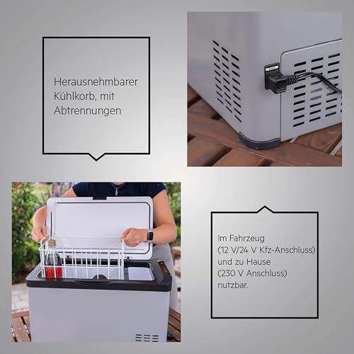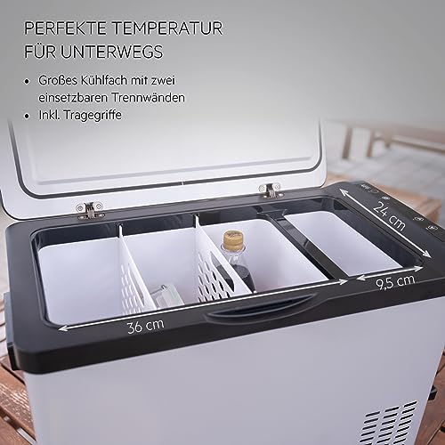 TRENNBAR: Die AEG Kompressor-Kühlbox wird mit einem herausnehmbaren Korb und 2 zusätzlichen Trennern zum Abtrennen des Kühlbereichs geliefert • PRAKTISCH: Die AEG Kompressor-Kühlbox besitzt zwei unterschiedliche Bereiche: einen Kühlbereich und ein Gefrierfach • BEQUEM: Der Temperaturbereich der AEG Kompressorkühlbox kann bequem über ein Touch-LCD-Display eingestellt werden • FLEXIBEL: Die Kompressor-Kühlbox von AEG hat eine sehr starke Kühlleistung; Zudem hat sie bei 12 V die gleiche Kühlleistung wie bei 230 V; Sie kann daher unterwegs und mithilfe eines Adapters auch in den eignen vier Wänden eingesetzt werden • GROß: Die AEG Kompressor-Kühlbox verfügt über ein Fassungsvermögen von bis zu 30 l; Sie eignet sich beispielsweise für 44 x 0,33 l Getränke oder 12 x 0,5 l oder 6 x 1,5 l Flaschen mit einer Stehhöhe von max. 32 cm • KOMPAKT: Die AEG Kompressor-Kühlbox hat ein platzsparendes und zugleich stilvolles Design