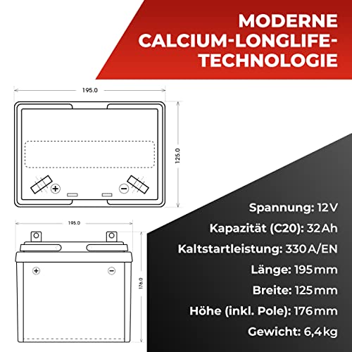 BlackMax U1-9 12V Batterie – Auch bei Kälte und Feuchtigkeit extrem leistungsstark und zuverlässig: dank der neuesten Calcium-Longlife-Technologie und einer erhöhten Startleistung von +30%. • Wartungsfrei & rüttelfest – Geschlossen und fest verbaut (SMF-Bauweise) erfüllt der Bleiakku sämtliche OE-Erstausrüster-Standards. Die 12 Volt Batterie wird gefüllt und vorgeladen geliefert. • Sofort einsatzbereit – Aufladbare Nassbatterie (Blei-Säure), U1-9-Standard, Maße: 195 x 125 x 176mm, Gewicht: 6,4kg, Starterbatterie 12V, Kapazität (C20): 35Ah, Kaltstart: 350A/EN, Pluspol LINKS • Optimiert für Rasenmähertraktor & Co. – Dank seiner hohen Kaltstartwerte eignet sich der Langzeit-Akku v.a. für Rasentraktoren, Aufsitzrasenmäher, Rasenmähertraktoren, Kit Cars und Winter-Fahrzeuge. • BlackMax by BIG – Starke Batterien für starke Maschinen: Als Untermarke des deutschen Familienunternehmens BATTERIE INDUSTRIE GERMANY steht BlackMax für Power – auch unter harten Bedingungen.