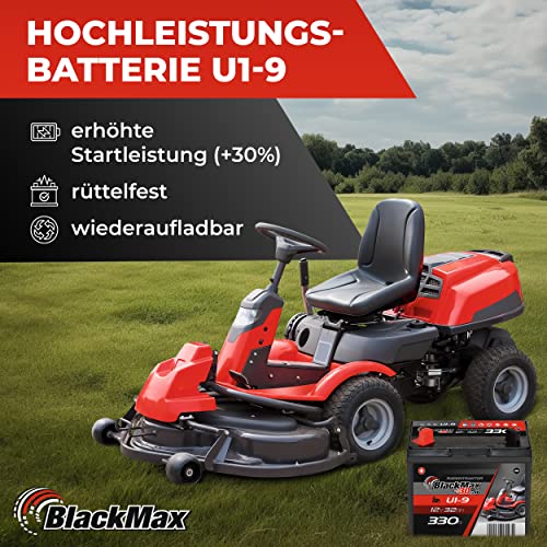 BlackMax Rasentraktor Batterie 12V 35Ah 350A (Pluspol links) – U1-9 +30% Starterbatterie (12 Volt) für Aufsitzmäher und Rasenmäher-Traktoren, wartungsfrei & wiederaufladbar
