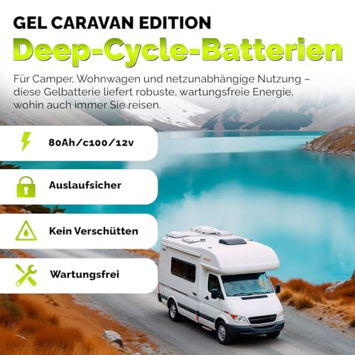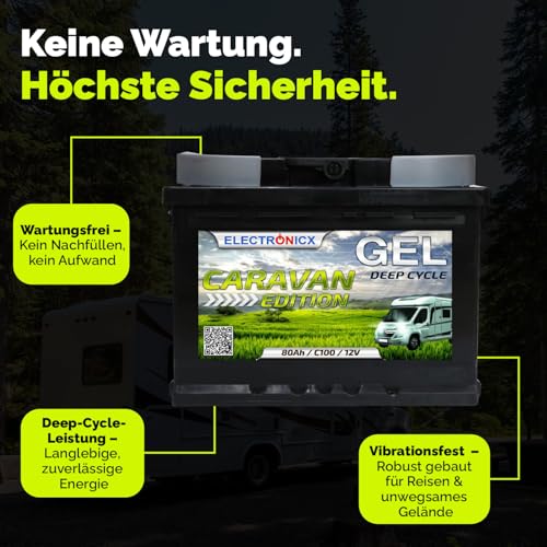 Startseite » Produkte » Electronicx GEL Versorgerbatterie 12V 80Ah Caravan Edition – 80Ah Deep Cycle Batterie für Wohnmobil, Van, Boot, Solar, PV, Marine, Freizeit, 242×175×190 mm, GEL-Technologie, geladen, wartungsfrei
