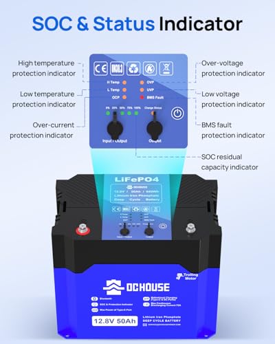 [Exklusive Outdoor-Batterie] 12V 50AH Trolling-Batterie ausgestattet mit DC und TYPE-C, zwei Lade- und Entladeschnittstellen und Unterstützung für Mobiltelefone, Computer, Drohnen, Kameras, Autokühlschränke und eine Vielzahl von DC-Ladegeräten, perfekt für Trolling-Motoren. Das Design mit festem Loch verhindert, dass die Batterie herunterfällt und durch externe Stöße erschüttert wird. • [Maximale Dauerentladung 1,5C] Im Vergleich zur Entladungsrate von 1C anderer Lithiumbatterien ist die 12V 50Ah Trolling-Lithiumbatterie mit einer Entladungsrate von 1,5C und einem maximalen Dauerentladungsstrom von 75A effizienter und für mehr Lasten geeignet. • [Zuverlässige Klasse A-Zelle] 50Ah Lithium-Batterie für Trolling-Motoren mit Automobil-Klasse A-Zelle, höhere Energiedichte, stabilere Leistung, geringere Selbstentladung, so dass die Lebensdauer der Batterie, Stabilität und Sicherheit sind sicherer, sowohl die außerhalb bevorzugte Batterie. • [Umfassender] 50Ah Lithium-Batterie integrierte 75A Batterie-Management-System, mit Überladung, Überentladung, Überstrom, Kurzschluss, Übertemperatur-Schutzfunktionen; Leicht überwachen die Batterie Lade- und Entladestatus durch die Kontrollleuchte; Einzelschalter steuert das Laden und Entladen von DC Ports. • [Dank der ausgefeilten Lithium-Batterie-Technologie kann die LiFePO4-Batterie eine hervorragende Leistung über eine Lebensdauer von 10 Jahren erbringen, was bedeutet, dass diese Lithium-Batterie über 4000 Zyklen bei 100 % SOC (Ladezustand) und DOD (Entladetiefe) aufweist.) Im Vergleich zu Blei-Säure-Batterien sind die kleineren und leichteren Lithium-Batterien für die meisten Menschen die erste Wahl.