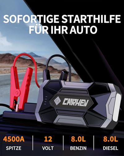 CARHEV Starthilfe Powerbank für Pkw, 4500A Starter Powerbank (Bis Zu 8,0L Benzin Oder 8,0L Diesel), 12V Booster Auto Starthilfe mit LED, Jump Starter mit Starthilfekabel und 2 USB Ausgänge