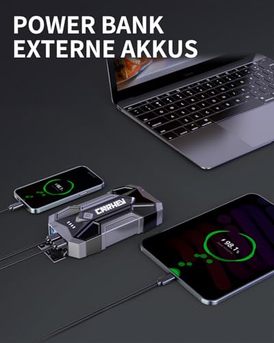 【LEISTUNGSSTARKER AUTO STARTER】Der CARHEV auto starter powerbank liefert einen starken Spitzenstrom von 4500A und startet Ihr Auto mit leerer Batterie in Sekundenschnelle, selbst bei extremen Temperaturen. Die verbesserten Starthilfekabel starten sicher bis zu 8,0-Liter-Benzin- und 8,0-Liter-Dieselmotoren und eignen sich für Pkw, Motorräder, Geländefahrzeuge, Transporter, Wohnmobile, UTVs, Lkw, Boote usw. Schluss mit dem Liegenbleiben wegen einer leeren Batterie • 【INTELLIGENTES SICHERHEITSSYSTEM】Der CARHEV starthilfe powerbank für pkw ist mit zehn verschiedenen Schutzsystemen ausgestattet und verfügt über eine hervorragende Leitfähigkeit und robuste, intelligente Starthilfekabel. Er funktioniert selbst bei extremen Temperaturen von -20 °C bis 60 °C. Der CARHEV auto starter powerpack verfügt über eine intelligente Anzeige und einen Summer, die Sie an die korrekte Funktion erinnern • 【MULTIFUNKTIONALES STARTHILFE】Der CARHEV ist nicht nur ein car jump starter, sondern auch eine tragbare Powerbank und ein LED-Notlicht. Er verfügt über zwei USB-Ausgänge (9V/2A) und (5V/2A), darunter einen QC3.0-USB-Anschluss zum schnellen Aufladen von Smartphones, Tablets und anderen Mobilgeräten. Die integrierte LED-Leuchte bietet drei Modi: Taschenlampe, Blitzlicht und SOS-Licht. Der ideale Begleiter für Camping, Outdoor, Notfälle und Reisen • 【KOMPAKT & UNAUFFÄLLIG】Der batterie booster verfügt über ein robustes, wasserdichtes Gehäuse mit einer Schutzhülle, die Verschleiß effektiv verhindert. Dank seines kompakten Designs passt er problemlos ins Handschuhfach. Das IP65-zertifizierte Gehäuse schützt das Innere vor Regen, Staub und äußeren Einflüssen und eignet sich daher für eine Vielzahl anspruchsvoller Arbeitsumgebungen • 【LIEFERUMFANG】CARHEV Auto Starthilfe Powerbank, Smart-Starthilfekabel, USB-Ladekabel, Tragbare Aufbewahrungstasche, mehrsprachige Bedienungsanleitung. Sie erhalten außerdem 2 Jahre technischen Support. Bei Problemen mit dem Produkt kontaktieren Sie uns bitte. Unser Kundenservice antwortet Ihnen innerhalb von 24 Stunden • 【TIPPS】Stellen Sie vor dem Starten des Fahrzeugs sicher, dass der Ladestand der CARHEV-Batterie über 50 % liegt. Bei längerer Nichtbenutzung wird empfohlen, die CARHEV Powerbank starthilfe alle 2–3 Monate aufzuladen, um den Zustand der Starthilfe-Powerbank zu erhalten