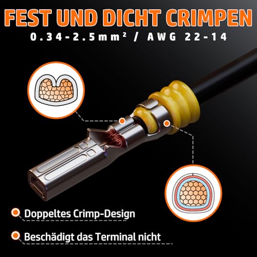 Kfz Stecker Crimp Set: Enthält eine Crimpzange, Abisolierzange, 1/2/3/4/5/6 polig wasserdichte elektrische Steckverbinder, 100 pcs männlichen/weiblichen Anschlussstifte, 3 Größen gummierten Kabeldichtungen und 2 pcs Abziehwerkzeug. Dieses All-in-One-Werkzeugset hilft Ihnen, Projekte effizienter umzusetzen. Alles in einer Box für einfache Aufbewahrung und Handhabung. • Profi-Kabelcrimpwerkzeug: Dank eines effizienten Ratschemechanismus und professioneller Crimp-Einsätze gewährleistet die PEBA-Crimpzange konsistent hohe Crimp-Qualität mit minimalem Aufwand. Sie verfügt über einstellbare Crimpkraft und einen Schnelllösehebel. Ideal für Leitungen AWG 22-14 (0,34–2,5 mm²) und AMP SUPERSEAL 1.5 SERIES-Autosteckverbinder. • Widerstandsfähiger: Der wetterfeste Steckverbinder besteht aus PA66-Nylon und bietet IP67-Wasserschutz. Dieses Material verfügt über eine gewisse Thermostabilität und macht die Stecker langlebig sowie verschleißfest. Auch nach wiederholtem Ein- und Ausstecken bleibt er intakt. Er eignet sich ideal für Kabelverbindungen in marinen Umgebungen, bei Autos, LKWs, Booten, Motorrädern und ähnlichen Anwendungen. • Hochleitfähige Kontakte: Die Kontakte im Open-Barrel-Stil sind aus kupferbeschichtetem Material mit hoher Leitfähigkeit gefertigt, wodurch der Kontaktwiderstand reduziert wird. Dies ermöglicht einen stabilen Stromfluss, erhöht die Sicherheit elektrischer Fahrzeugsysteme und beugt Kurzschlüssen sowie potenziellen Risiken vor. Nennwerte: 14A / 24V. Sie sind perfekte Steckerersatzsteckverbinder. • Vielseitig für Automotive & DIY-Projekte: Ob Motorräder, LKWs, Boote oder elektrischen Geräte – dieses Kit ersetzt Zündkerzen und stellt zuverlässige Drahtverbindungen her. Dank des intuitiven Rastdesigns ist die Montage einfach, und die beiliegenden Entfernungswerkzeuge ermöglichen eine sichere Demontage ohne Rutschen oder Kompromisse. Ideal für professionelle Techniker ebenso wie für DIY-Enthusiasten!