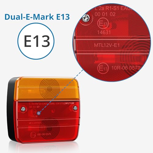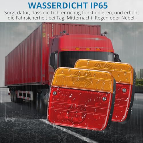 【Universal Anhängerbeleuchtung】AUTOUTLET Anhänger Rückleuchten Komplett Set bieten mehrere Funktionen, Blinker 21W, Bremsleuchten 21W, Rückleuchten 5W und Kennzeichenleuchten 5W. Anhänger Beleuchtung ist mit 12V-Spannung ausgelegt, und mit den meisten Fahrzeugen kompatibel und eignet sich für Anhänger, Wohnwagen, Lastkraftwagen, landwirtschaftliche Fahrzeuge, Traktoren, Wohnmobile und Lkw • 【Hochwertige Material】Das Gehäuse der Rückleuchten Anhänger besteht aus PMMA (Polymethylmethacrylat) + ABS (Acrylnitril-Butadien-Styrol) und bietet eine hervorragende Bruchsicherheit, Stoßfestigkeit und Langlebigkeit. Es verwendet eine Vollhalogenlampe, die sich durch hohe Lichtdurchlässigkeit, erweiterte Leuchtweite, lange Lebensdauer und geringen Energieverbrauch auszeichnet • 【Für Straßenverkehr ZUGELASSEN】Diese Anhänger Beleuchtung komplett Set ist E13-zertifiziert, entspricht der aktuellen ECE-R1-Verordnung und den Verkehrssicherheitsstandards und gewährleistet somit die Sicherheit im Straßenverkehr • 【Schnell Installation】Anhänger Rückleuchten Set enthält ein 7,5 Meter langes Kabel und einen 7-poligen Stecker, sodass keine zusätzliche Verkabelung erforderlich ist. Integrierte Befestigungsschrauben an der Rückseite der Rückleuchte gewährleisten eine einfache Installation an Fahrzeugen und sorgen für einen sicheren und dauerhaften Sitz • 【Wasserdicht & Sicherheit】Mit einer hochwertigen lichtdurchlässigen Schutzabdeckung und einem Reflektor, mit der Schutzart IP65 funktioniert es zuverlässig bei Tageslicht, in der Nacht, bei Regen oder Nebel. Dies erhöht Ihre Fahrsicherheit und ermöglicht einen sicheren Betrieb • 【Größe】Abmessungen des Rücklichts: 10,5 x 9,5 x 5 cm, Abstand zwischen zwei Schrauben: ca. 5,5 cm; Kabellänge vom Licht zum Stecker: 7,5 M; Kabellänge zwischen den Lichtern: 2,5 M (Hinweis: Bitte überprüfen Sie vorab, ob die Abmessungen des Rücklichts mit dem verfügbaren Platz in Ihrem Fahrzeug kompatibel sind