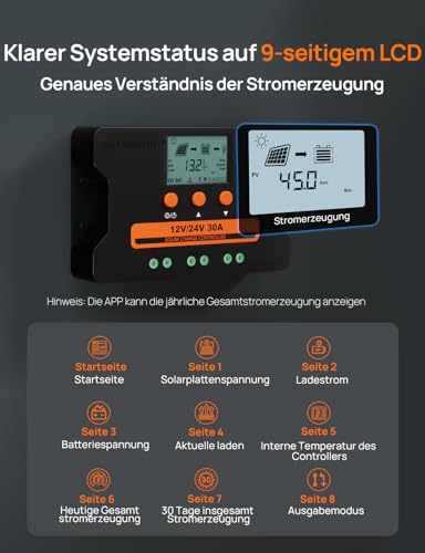 Intelligente Spannungserkennung: Automatische Erkennung von 12-V-/24-V-Systemen und zwei USB-Anschlüsse (5 V/2 A) für schnelles Laden von Geräten. Optimierung der Effizienz von Solarmodulen durch integrierte Datenerfassung für 30 Tage zur Verfolgung der Solarstromerzeugung. • Remote-Überwachung: Mit Bluetooth-Funktion für direkte Fernverbindung und -steuerung über die App, Reichweite bis zu 30 m. • Batteriekompatibilität: Kompatibel mit allen 12-V-/24-V-Batterien. Wählen Sie einen vorgegebenen Modus (LFP, FLD, SLD, GEL) oder eigene Parameter (CUS-Modus) für ein individuelles Ladeverfahren. • Zuverlässige Steuerung: Integrierte Bluetooth- Funktion für mehr Einfachheit. Fortschrittliche Komponenten gewährleisten eine Genauigkeit der Spannungs-/Strommessung von <1 %. Das übersichtliche LCD-Display zeigt Echtzeitdaten an; die intuitive Steuerung über drei Tasten ermöglicht eine nahtlose Anpassung der Einstellungen. • 3-phasiges PWM-Laden: Intelligentes Bulk-/Absorptions-/ Float-Laden für mehr Effizienz und längere Batterielebensdauer. Integrierter Verpolungs-, Kurzschluss-, Überstrom-, Unter-/Überdruckschutz und Überhitzungsschutz. • Breites Anwendungsgebiet: Robuste Metallrückseite für effektive Wärmeableitung und optimalen Schutz der inneren Komponenten; ideal für Wohnmobil-Camping, Bootssport und viele weitere Outdoor-Anwendungen.