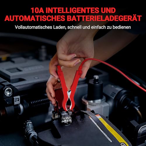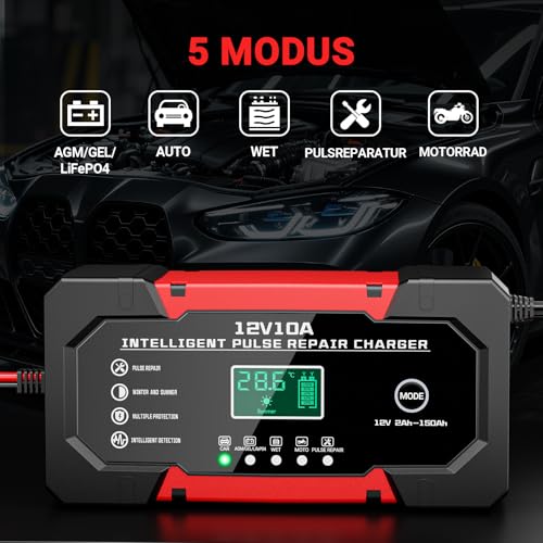 Intelligentes Schnellladen: Dieses autobatterie ladegerät mit 10A Leistung lädt schneller als herkömmliche ladegeräte für autobatterien geeignet für alle 12V Blei Säure Batterien wie AGM GEL SLA EFB sowie LiFePO4 Batterien ideal für Autos Motorräder LKWs Boote und mehr • Einfache Bedienung: Das ladegerät autobatterie funktioniert nach dem Plug and Play Prinzip schließen Sie es an und der Ladevorgang startet automatisch über die Mode Taste können verschiedene Programme wie Auto,AGM,GEL,LiFePO4,WET,MOTO oder Reparatur ausgewählt werden • LCD Anzeige: Das Batterieladegerät verfügt über ein gut lesbares LCD Display das Ladeinformationen wie Spannung Strom Batteriestand Umgebungstemperatur sowie Sommer und Wintermodus deutlich darstellt zudem werden Fehlerhinweise wie Verpolung sofort angezeigt • Sicheres Laden: Dieses Erhaltungsladegerät bietet umfassenden Schutz und verfügt über 8 Sicherheitsfunktionen, darunter Verpolungsschutz, Kurzschlussschutz, Überhitzungsschutz, Überstromschutz und Temperaturkompensation, um die Sicherheit des Ladevorgangs zu gewährleisten • Reparaturfunktion:Dieses Autobatterieladegerät verfügt über eine integrierte Impulsreparaturfunktion, die die Sulfatierung und Säureschichtung in der Batterie reduziert und so dazu beiträgt, die Lebensdauer der Batterie zu verlängern. Hinweis: Nicht geeignet für beschädigte Batterien. Nicht geeignet für Lithiumbatterien