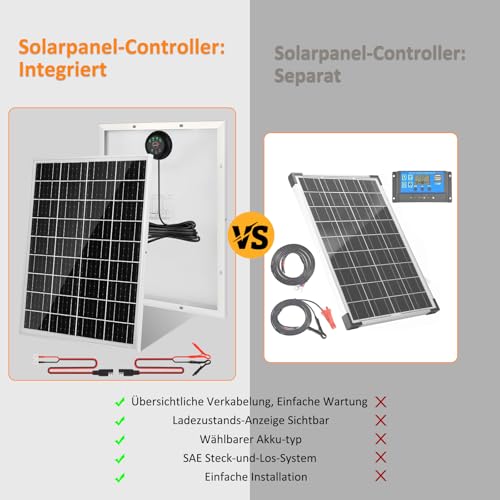 【50W Solarpanel 12V System-Set】50W Solarmodule Solarpanel kit ideal für das Aufladen der Batterien von 12V-Systemen,sie erhalten 1 Stück 50-W-Mono-Solarpanel, Eingebautem 1 Stück 6A PWMs Laderegler mit 9.8FT 18AWG SAE-Solarkabel, 1 Stück 19.7 inch-Kabel mit Krokodilklemmen und 1 Stück 19.7 inch-Kabel mit O-Ring-Anschluss.50W 𝐒𝐨𝐥𝐚𝐫 𝐏𝐚𝐧𝐞𝐥 Abmessungen: 570x470x17mm(22.44×18.5×0.67 in). Gewicht: 3.1kg(6.83lb). Der 6 A-Solarladeregler ist mit verschiedenen Arten von Batterien kompatibel, z. B. GEL, AGM, LiFePO₄-Batterien. • 【Smart PWMs Technology】Dieses 12v 50W Solarpanel Batterieladegerät ist mit einzigartiger Smart PWMs Built-in Technologie gefertigt. Verbesserte 3-Stufen-Ladung. Der verbesserte 3-Stufen-Ladealgorithmus ermöglicht es, die 12-Volt-Batterie effektiver zu laden, gewährleistet eine sichere Aufladung der Batterie und verlängert die Lebensdauer der Batterie. Das Solarladegerät stoppt das Laden, wenn die Batterie voll geladen ist, und setzt sich automatisch wieder auf, wenn die Batterie entladen ist, völlig kostenlose Wartung. • 【Visual Charging Level】 Die Ladepunktindikatoren ermöglichen es, die Ladephase zwischen 25% -50% -75% -100% visuell zu überwachen. Es ist nicht nur ein Solarbatterieladegerät, es ist ein fortschrittlicher Solarbatterieladegerät-Warter. Ein vollautomatisches, sorgenfreies intelligentes Solarbatterieladegerät mit Null-Überladung. Eingebautes Mehrfachschutz, einschließlich Kurzschluss, Antipolarität und Überhitzung, Wasser- und Blitzschutz, vollständiger Schutz der Batterie, maximaler Betriebsstrom 6A. • 【Ultraleichtes & Tragbar All-in-One-Design】50W Solarladeregler im integrierten Design – vereinfachte Installation. *Hinweise: 1.Im Leerlauf kann keine Spannung gemessen werden. Strom und Spannung sind erst messbar, wenn ein Akku angeschlossen ist und geladen wird. 2.Um eine Verpolung zu verhindern, darf erst nach korrektem Anschluss mit dem Laden begonnen werden. 3.Das Produkt verfügt über einen eigenen Controller und darf nicht zum Laden anderer Akkus oder Ladestationen verwendet werden, die bereits einen Controller besitzen. 4.Der Regler wird durch das Solarpanel gespeist. Bei schwacher Sonneneinstrahlung kann ein Neustart des Reglers auftreten, erkennbar am Blinken aller Kontrollleuchten. • 【Einfach zu bedienen】 Mit der fortschrittlichsten PWMs-Technologie beginnt dieses 12-Volt-Solarbatterieladegerät sofort zu laden, wenn es eine Batterie erkennt. Vorgebohrte Löcher ermöglichen eine schnelle Montage mit enthaltenen Befestigungshüllen, und alle Kabel sind Plug and Play, die eine einfache und schnelle Bedienungserfahrung bieten. Laden und steuern Sie jede 12-Volt-Batterie unabhängig mit wählbaren Lademodus – einschließlich 12V GEL, 12V AGM und 12V LiFePO₄- für alle Arten von Blei-Säure-Boot-, Auto-, Dump-Trailer-, Automobil-, Marine-, RV-, Powersport-, Camper- und Deep-Cycle-Batterien, einschließlich GEL, AGM, LiFePO₄-Batterien.