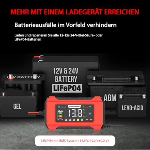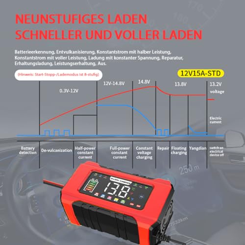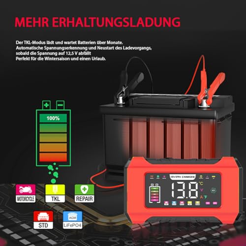 【15A LiFePO4 Blei-Säure-Batterieladegerät】 Kompatibel mit allen 12- oder 24-Volt-Blei-Säure-Batterien, Deep-Cycle-Batterien (z. B. AGM, STD, GEL, Wet, MF, EFB), LKWs, Rasenmähern, Wohnmobilen, SUVs, UTVs, ATVs. • 【9-stufiges Batterie-Erhaltungsladegerät】Unser 9-stufiger Ladeprozess (Batterieprüfung, Batterieentschwefelung, Soft-Start-Laden, Chargenladen, Absorptionsladen, Batterietest, Rekonditionierungsladen, Erhaltungs- und Erhaltungsladen sowie Überwachungsphase) sorgt für eine sicherere und effizientere Batteriewartung. Nach vollständiger Ladung schaltet das Ladegerät automatisch in den Erhaltungs-/Erhaltungsmodus (TKL), sodass Sie Ihre Batterie auch im Winter und während der Ferienzeit warten können. • 【Mehrere Sicherheitsvorkehrungen】Dieses Batterieerhaltungsladegerät ist mit mehreren Schutzfunktionen ausgestattet, darunter intelligente Steuerung, Temperaturkompensation, Unterladeschutz, Verpolungsschutz, Kühlsystem, Überstromschutz, feuerfestes Material, Überspannungsschutz und Kurzschlussschutz. Sie können Ihre Batterien jederzeit und überall sicher und zuverlässig laden. • 【Großes, helles und farbenfrohes informatives LCD-Display】Dieses verbesserte Autobatterieladegerät verfügt über ein extragroßes Display. Es zeigt wichtige Informationen wie Ladestatus, Spannung, Stromstärke, Temperatur (℉/°C), Ladezustand und mehr an. • 【Sicherheitsladegerät und Batterieladegerät-Wartungsgerät】Das tragbare Autoladegerät ist mit mehreren Schutzschichten ausgestattet und sorgt für sorgenfreies Laden. Funkenschutztechnologie verhindert versehentliche Funkenbildung, Verpolungsschutz bei falschem Anschluss sowie Überlade- und Kurzschlussschutz sorgen für die Batteriesicherheit. Die Impulsreparaturfunktion hilft, alte oder sulfatierte Batterien zu revitalisieren und ihre verlorene Leistung wiederherzustellen.