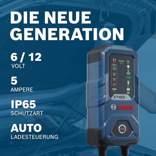 Bosch C40-Li Batterieladegerät, 5 Ampere, mit Erhaltungsladungs-Funktion – Autobatterie-Ladegerät für 6 V / 12 V Blei-Säure-, AGM-, EFB-, Gel-, SLI- Batterien sowie 12 V Lithium- (LiFePO4) Batterien