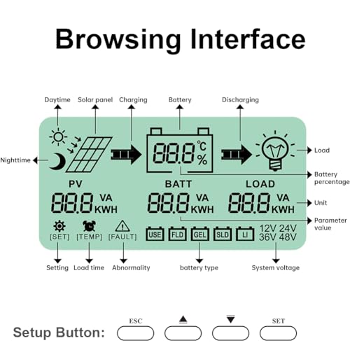 Erweiterte MPPT (Maximum Power Point Tracking) Technologie, Tracking-Effizienz von nicht weniger als 99,5%, die höchste Umwandlungseffizienz von 98%, etwa 25% höher als die traditionelle PWM-Ladeeffizienz. • 12/24VDC automatische Erkennung der Systemspannung, Unterstützung für verschiedene Batterietypen wie Gel-Batterien, verschlossene Batterien, offene Batterien, Lithium-Batterien und andere Batterieladeverfahren. • Der Solarladeregler bietet Überstromschutz, Kurzschlussschutz, Verpolungsschutz, Unterspannungs- und Überladeschutz, ein zuverlässiger Schutz für Ihre Geräte. • Intuitives LCD-Display, das den Status und die Daten klar anzeigt, kann die Modi und die Parameterkonfiguration umschalten, die visuelle Anzeige von Fehlern macht es dem Benutzer leicht, Systemfehler zu identifizieren. • Zwei USB-Anschlüsse ermöglichen das direkte Aufladen von Mobiltelefonen und anderen elektronischen Geräten und können zur Unterstützung des Rs485-Protokollmodells erworben werden, um den Kommunikationsbedarf bei verschiedenen Gelegenheiten zu erfüllen.