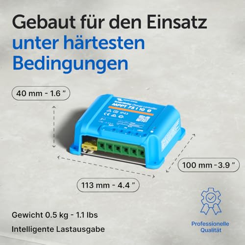 | Benefits | Maximale Energieausbeute durch MPPT, kontinuierliche Spannungs- und Stromüberwachung, sowie Fernsteuerung per Bluetooth und Unterstützung beim Wiederaufladen stark entladener Batterien. |