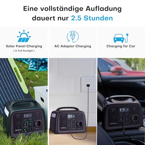 Kompakt und voller Power:ADKL 300W tragbare powerstation kann nicht nur mit dem dedizierten AC-Ladekabel 80W (im Lieferumfang enthalten) innerhalb von 4 Stunden schnell aufgeladen werden, sondern unterstützt auch reguläres Aufladen: Solarpanel-Ladung, Autoladung und Typ-C Ladung(40W/60W). Gib deinen Geräten 300W und 320Wh.Es kann Geräte gleichzeitig aufladen und mit Strom versorgen und ist ideal für den Einsatz im Freien und in der Freizeit. • Ultralanglebige LiFePO4-Technologie:2000 Ladezyklen and 10+ Jahre Nutzungdauer. Intelligentes BMS schützt vor Überhitzung, Überladung und Tiefentladung – umweltfreundlicher als herkömmliche Powerstations. • 9 Ladeanschlüsse und eine integrierte LED-Leuchte: Versorge all deine Geräte über vielseitige Ports. 1× Zigarettenanzünder (120W), 2× DC output (120W), 1× DC input (120W), 2x USB-A output (12W), 1× USB-C input (40W) und 1× USB-C input/output (60W),und 1x AC output 230V. • Solargespeiste Auszeit: Wenn deine Reise unendliche Energie braucht, lade nahtlos und nachhaltig mit einem 100W/200WSolarpanel. Kombiniere die Powerstation mit den ADKL Solarpanel 200W. Es wird nicht empfohlen, Solarmodule mit höherer Leistung zu verwenden, um Kurzschlüsse in der Maschine zu vermeiden. • Passend für verschiedene Szenarien:ADKL Tragbare Stromstation überzeugt durch ihr kompaktes und leichtes Design mit einer großen Kapazität, wobei sie nur etwa 3.8 kg wiegt. Dadurch eignet sie sich ideal für verschiedene Szenarien wie Autoreisen, Camping, Off-Grid-Freizeitaktivitäten und sogar zur Stromversorgung zu Hause. Zusätzlich ist sie mit einer LED-Beleuchtung ausgestattet und kann im Falle von Taifunen und Erdbeben auch als Notstromquelle verwendet werden. • All-Inclusive-Paket: Powerstation, AC-/Solar-/Auto-Ladekabel, Handbuch. 24 Monate Garantie & deutschsprachiger Kundenservice. Einfache Kontaktierung über Amazon-Nachrichtensystem.