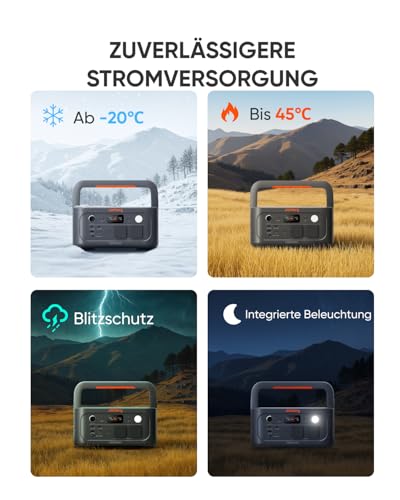 Immer genug Energie: Mit 512 Wh Kapazität und bis zu 500 W Dauerleistung hält die Explorer 500 V2 Kühlbox, CPAP, Laptop, Kamera oder Drohne zuverlässig am Laufen – egal ob zu Hause oder unterwegs. • Schnelles und leises Aufladen: ChargeShield 2.0 bringt die Powerstation in etwa 1,3 Stunden von 0% auf 100%, 0% – 80% gelingen in rund 52 Minuten, und der AC-Ladevorgang bleibt dabei mit bis zu 36 dB angenehm leise. • Vielseitige Anschlüsse für jeden Einsatz: Zwei AC-Steckdosen, USB-C und USB-A sowie ein 12‑V-KFZ-Port versorgen alle Geräte, die Sie täglich brauchen. Aufladen geht bequem über Netz, Solarpanel oder Auto, ganz ohne separates Netzteil. • Robust und langlebig: Der LiFePO4-Akku übersteht bis zu 6000 Ladezyklen bei mindestens 70 % Kapazität, arbeitet von −20 °C bis 45 °C zuverlässig und steckt dank robustem Gehäuse auch Outdoor-Einsätze locker weg. • Leicht zu tragen, sicher im Betrieb: Mit nur 5,7 kg und kompakten Maßen passt die Powerstation in jeden Rucksack oder Kofferraum. Die integrierte USV schaltet innerhalb von 10 ms auf Notstrom um, während der Eco-Modus Energie spart und der Dauerbetrieb Geräte mit geringem Verbrauch kontinuierlich versorgt.