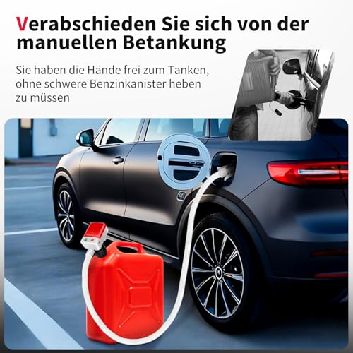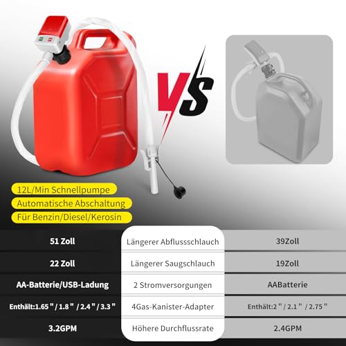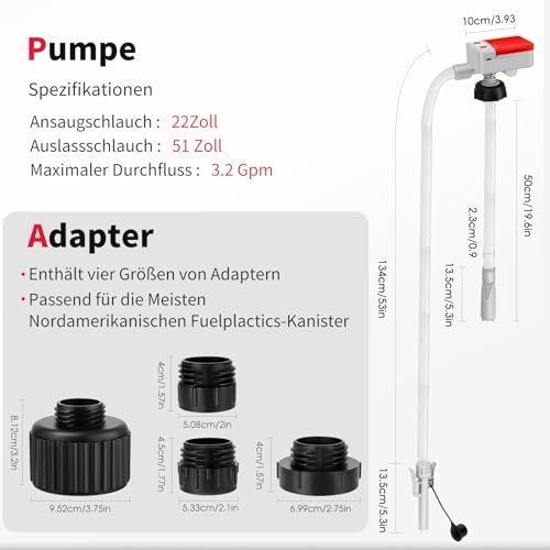 Automatische Abschaltsensor-Pumpe: Eine automatische Kraftstoffpumpe, die bis zu 3,2 Gallonen pro Minute (12 Liter/Minute) fördern kann – geeignet für Benzin, Diesel, Kerosin oder kein Trinkwasser. Stoppt automatisch, um Kraftstoffverlust zu verhindern. Integrierte Halterung fixiert die Düse am Auffangbehälter für freihändige Bedienung. • Zwei Stromversorgungsoptionen: USB- oder Batteriebetrieb. Sie können entweder 4 AA-Batterien (nicht im Lieferumfang enthalten) oder USB Type-C verwenden. Im Notfall reichen auch 2 AA-Batterien (allerdings verringert sich die Fördermenge bei schwächerer Stromversorgung). Diese tragbare Pumpe eignet sich ideal für den Transport von Benzin, Diesel, Kerosin, Leichtöl und anderen nicht trinkbaren Flüssigkeiten. • Extra langer Schlauch: Mit einem 52 Zoll (ca. 1,32 m) langen Schlauch bietet unsere Pumpe stärkeren Sog und ist mit verschiedenen Kraftstoffbehältern kompatibel, einschließlich hohen Kanistern, Tanks und Vorratsbehältern. Sie erreicht sogar den Boden von Rennfahrzeug-Tanks im Kofferraum (vom Boden bis zum Tank im Fahrzeug). • 4 Adapter für verschiedene Größen: Enthält 4 Tankadapter (4,2 cm / 4,5 cm / 6,1 cm / 8,5 cm bzw. 1,65″ / 1,8″ / 2,4″ / 3,3″), passend für die meisten nordamerikanischen Standardtanks. Hinweis: Nicht kompatibel mit Scepter Smart Control-Kanistern. • Vielfältige Anwendungsmöglichkeiten: Ein einfach zu bedienender, vielseitiger elektrischer Transferpumpen, der direkt auf Standard-Kraftstoffbehälter aufgeschraubt werden kann, um ein verschüttungsfreies Absaugen zu ermöglichen. Praktisch für die Aufbewahrung im Kofferraum, Garage, Werkstatt, Scheune oder Schrank – ideal für schnellen, sauberen und zuverlässigen Flüssigkeitstransport. Perfekt geeignet für Autos, Motorräder, Boote, Rasenmäher, Schneefräsen, Generatoren, Aquarien und mehr.
