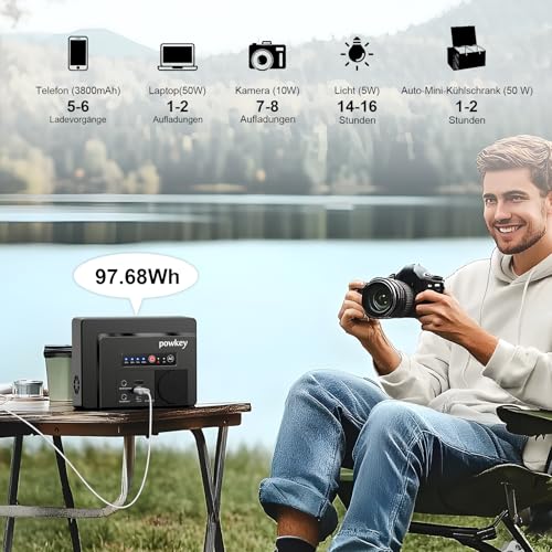 Powkey Tragbare Powerstation 26400mAh/97.68Wh Powerbank Steckdose mit 100W/230V AC Ausgang, 12V 8A DC, PD 65W USB C Externer Akku Power Station Camping Tablet Handy