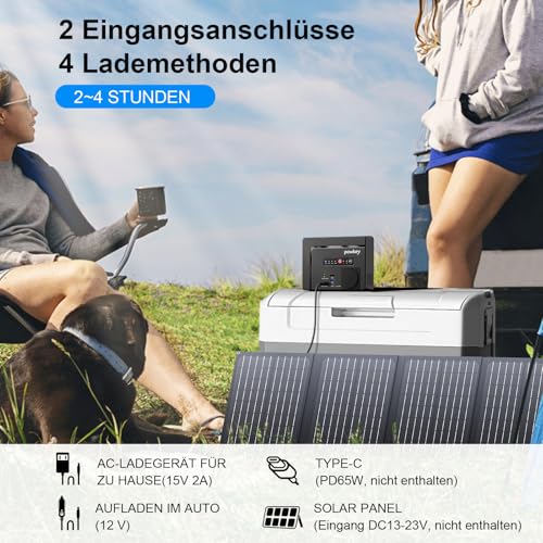 MEHRERE AUSGANGSPORTS: Die 26400mAh Powerbank ist mit einem 100W/230W AC-Anschluss, einem DC 12V/8A Anschluss (max), einem USB-C Anschluss mit 65W (max) und 2*USB-A Anschluss mit 18W (max). Das bedeutet, dass die Powerbank problemlos eine Vielzahl von Kleingeräten mit weniger als 100 Watt auflädt, während man unterwegs ist. Um die Wechselstromsteckdose zu aktivieren, muss der Netzschalter 3 Sekunden lang gedrückt werden. Zum Einschalten 1 Sekunde und zum Ausschalten 3 Sekunden lang drücken. • EFFIZIENTES LADEN: Diese aufladbare Mini powerstation hat eine Kapazität von 26400 mAh (97,68 Wh). Es kann Ihr Telefon (3800mAh) mehr als 5-6 Mal aufladen. Dieses tragbare powerstation verfügt über eine integrierte MPPT-Technologie, die durch drei praktische Lademodi höchste Ladeeffizienz gewährleistet: Steckdose (6 Stunden), (empfohlenes 40/60W Solarpanel, 13-23 V, 7 Stunden), 12-V-Autoladegerät ( 6,5 Stunden). 5.5×2.1mm Rundstecker. • TRAGBARE POWERBANK: Die Powerbank wiegt nur 1 kg und hat die Maße 18 x 4,5 x 14,5 cm. Es kann beim Wandern im Rucksack oder in der Handtasche getragen werden. Powerbank zur Stromversorgung Ihres 12V-Kühlbox betreiben. Dieser Solargenerator ist ideal für Outdoor-Aktivitäten (Camping, Angeln, Jagen, Wandern usw.) und Notfälle zu Hause (Stromausfälle, Hurrikane). • SICHERE STROMVERSORGUNG: Die Powerbank verfügt über ein eingebautes BMS-Akku-Management-System mit mehreren Schutzfunktionen wie Überentladungsschutz, Überstromschutz, Kurzschlussschutz und Übertemperaturschutz, um die Sicherheit von Ihnen und den Ladegeräten zu gewährleisten. Der Externer Akku ist mit Mobiltelefonen, Tablets, Kamera • IM LIEFERUMFANG ENTHALTEN: 1 x 26400mAh Camping Powerbank, 1 x AC-Ladegerät,1 x KFZ-Ladekabel,1 x Adapter für Zigarettenanzünder,1 xBedienungsanleitung. Die tragbare Powerbank wird mit einer Aufbewahrungsbox für mobilen Strom und einigen Ladekabeln geliefert.