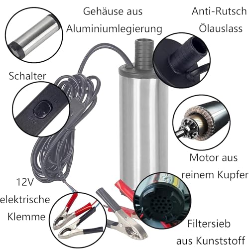 【Durable and Efficient Diesel Pump-12V 51MM】Die Dieselpumpe ist aus hochwertigem Edelstahl-Material, gute Dichtungsleistung, Korrosionsbeständigkeit, niedriger Stromverbrauch und hohe Ausgangsleistung. Maximale Durchflussmenge: 30L/min, Pumpendurchmesser: 51mm, Schlauchaußendurchmesser: 19mm, geeignet für 19mm Wasserleitung • 【Reiner Kupfermotor-Low Noise】Die Dieselpumpe verwendet einen DC 12V DC reinen Kupfermotor, der speziell für Diesel ausgelegt ist. Der Boden der Pumpe muss vollständig in die Flüssigkeit getaucht werden, wenn sie in Gebrauch ist. • 【Edelstahl-Aussehen Design, einfach zu bedienen und zu reinigen】 Es gibt einen Kunststofffilter an der Unterseite der Kraftstoffpumpe, der nicht leicht zu rosten ist und Verunreinigungen am Eindringen verhindern kann. • 【3M Cord + Alligator Clips*2】 Diese elektronische Dieselpumpe hat ein 3M langes, flexibles Stromkabel, das überall hinreichen kann, um Öl leicht anzusaugen. Die Saugpumpe eignet sich für Erntemaschinen, große Landmaschinen, Baumaschinen, große Radtraktoren und andere Fahrzeuge, bei denen das Tanken nicht bequem ist. • 【Caution】1. Benzin oder andere brennbare Flüssigkeiten sind streng verboten, diese elektronische Ölpumpe zu verwenden.2. Bitte verwenden Sie diese Pumpe nicht kontinuierlich für mehr als 20 Minuten, müssen Sie für etwa 10~20 Minuten nach jeder Arbeit ruhen.3. Wenn Sie den Schalter zuerst einschalten und dann die Pumpe in die Flüssigkeit tauchen, wird die Pumpe nicht funktionieren.4. Lassen Sie die Dieselpumpe nicht leer laufen.