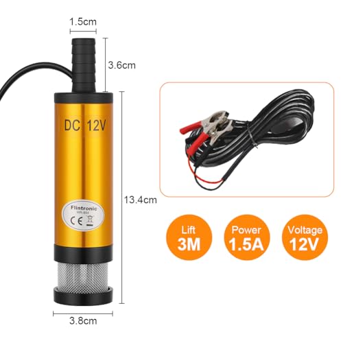 Flintronic DC 12V 38mm Ölpumpe Wasser Pumpe, Mit Clip Diesel Heizöl Wasser Tauchpumpe Treibstoff Transfer Mit herausnehmbarem Filter für Auto, KFZ, Caravan, Marine Boot