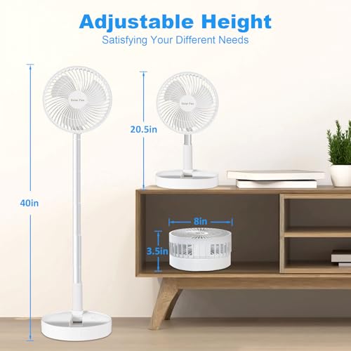 🔋【Langlebiger Batteriebetrieben Ventilator】Der ventilator akkubetrieben mit hoher Kapazität und eingebautem 5200mAh Akku bietet kontinuierliche Kühlung für bis zu 4-10 Stunden und unterstützt das Aufladen über einen Typ-C Eingangsanschluss. Gleichzeitig verfügt unser standventilator über einen USB Ausgangsanschluss, der als Powerbank fungiert und Ihnen ermöglicht, verschiedene Geräte wie Kameras, Telefone, Taschenlampen und mehr aufzuladen. • 🌞【Effizientes Solarpanel】Machen Sie sich Sorgen, wie Sie einen akku ventilator beim Camping verwenden können, wenn es draußen keinen Strom gibt? Dieser camping ventilator wird mit einem 9 x 7,8 Zoll großen monokristallinen Silizium Solarpanel geliefert, das schnell über Sonnenlicht aufgeladen werden kann. Es dauert nur 5 Stunden, um über ein hocheffizientes Solarpanel vollständig aufgeladen zu werden, das grüne Energie liefert und die Batteriesorgen beseitigt. • 🍃【Kompakt Faltbarer Ventilator】Dieser tragbarer solarventilator wiegt nur 0,85 kg und lässt sich auf eine äußerst kompakte Größe von nur 8 x 3,5 Zoll zusammenfalten und passt problemlos in einen Rucksack oder eine Schublade. Die Höhe des standventilatoren kann vollständig von 20,5 Zoll bis 40 Zoll eingestellt werden, der Kopfneigungswinkel ist um 180 Grad verstellbar, was Ihnen mehr Auswahlmöglichkeiten in Bezug auf unterschiedliche Höhen und Winkel bietet. • ❄️【3 Geschwindigkeitsstufen】Drei Windstufen – Brise / Sanfter Wind / Starker Wind. Passen Sie Ihren Komfort mit 3 einstellbaren Geschwindigkeiten an und ermöglichen Sie so eine individuelle Kühlerfahrung. Der standing fan kann nicht nur einen starken Luftstrom erzeugen, um die Kühlwirkung schnell zu verbessern, sondern arbeitet auch mit einem niedrigen Geräuschpegel von 32 bis 40 dB und bietet Ihnen eine ultraleise und komfortable Kühlumgebung, egal ob Sie arbeiten, lernen oder schlafen. • 😍【Einzigartiges Design】Der mini ventilator lässt sich ohne Werkzeug leicht auseinandernehmen und das Frontgitter und die Ventilatorflügel mit Wasser reinigen. Die Unterseite des Ventilators verfügt über ein rutschfestes Silikonpolster, das Vibrationen reduziert und die Reibung erhöht, sodass der tischventilator fest an seinem Platz bleibt. Zusätzlich befindet sich am oberen Standfuß eine Kerbe, in die Sie Zeitschriften, Schlüssel, Snacks, Telefone und andere kleine Gegenstände legen können. • 👍【Multifunktionaler Ventilator 3 in 1】Dieser usb ventilator verfügt über ein faltbares Design, das die Aufbewahrung zum Kinderspiel macht. Er kann auf der Arbeitsplatte als Tischventilator, auf dem Boden als Bodenventilator und im Schlafzimmer als Standventilator verwendet werden. Ob drinnen oder draußen, der tragbare Ventilator kann alle Szenarien problemlos bewältigen. Perfekt für Schlafzimmer, Zuhause, Büro, Küche oder Outdoor-Aktivitäten wie Reisen, Camping, Picknicks und Angeln.
