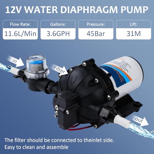 Startseite » Produkte » Wasserpumpe 12V DC Membranpumpe 3,1 Bar (45 PSI) Selbstansaugend Druckpumpe mit Druckschalter, 11,6 L/min 3.06 GPM Druckwasserpumpe, RV Wasserpumpe für Wohnwagen, Yacht, Camper, Garten