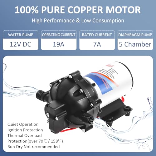 Leistungsstarke 12V Druckwasserpumpe: Diese selbstansaugende Membranpumpe arbeitet mit einer Spannung von DC 12 V, einem maximalen Durchfluss von 13,5 Litern pro Minute (3.5 GPM) und einem Abschaltdruck von 3,1 Bar (45 PSI). Perfekt für Wohnmobile, Boote und Camping – sie liefert zuverlässig sauberes Wasser, wo immer Sie es brauchen. • Automatische Drucksteuerung: Die Wasserpumpe schaltet sich automatisch ein oder aus, sobald der Wasserhahn geöffnet oder geschlossen wird. Ein integrierter Überdruckschutz sorgt dafür, dass die Pumpe bei Erreichen von 45 PSI automatisch abschaltet, um Schäden zu vermeiden und die Lebensdauer zu verlängern. • Kupferkernmotor mit Sicherheitsabschaltung: Ausgestattet mit einem hochwertigen Motor aus reinem Kupfer bietet diese 12V DC Membranpumpe einen zuverlässigen Überhitzungs- und Überlastungsschutz. Bei zu hoher Temperatur wird der Stromkreis automatisch unterbrochen – die Pumpe startet erneut, sobald der Betrieb wieder sicher ist. • Abnehmbarer Vorfilter: Die Wasserpumpe ist mit einem transparenter, leicht zu reinigender Filter ist im Lieferumfang enthalten. Dieser Vorfilter schützt die Pumpe effektiv vor Schmutzpartikeln und verlängert die Lebensdauer des Systems – ideal für dauerhaft sauberes Wasser beim Duschen, Spülen oder Bewässern. • Vielseitige Einsatzmöglichkeiten: Diese 12V Wohnmobil Wasserpumpe ist ideal für den Einsatz in Wohnwagen, Booten, Gärten und beim Camping. Ob für den Wasserhahn, die Außendusche, Gartenbewässerung oder Autowäsche – sie ist flexibel einsetzbar und überall dort hilfreich, wo Druckwasser gebraucht wird.
