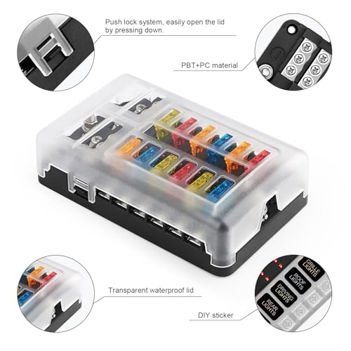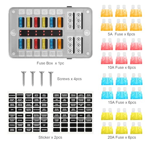 【Umfassendes Sicherungs-Set】 Der 12-Volt-Sicherungskasten Enthält 24 Sicherungen: 6 x 5A sicherung, 6 x 10A sicherung, 6 x 15A sicherung, 6 x 20A sicherung für vielfältige Elektroinstallationen, plus einen 1 x 12-fach-Sicherungskasten, 2 x gerätenamensschilder, 4 x schrauben. Alles für eine einfache Installation. • 【Hochwertiges & brandsicheres Material】12 Fach flachsicherungskasten besteht aus hitzebeständigem PBT+PC-Kunststoff mit flammhemmenden Eigenschaften. Die kfz sicherungshalter verursacht kaum Bruch, Verformung, Verbrennung oder Kurzschluss. Sicherer verwenden. Ideal für anspruchsvolle Umgebungen. • 【Praktische LED-Störungsanzeige】Rote Warnleuchte pro Sicherung signalisiert sofort Defekte. Wenn der strom hochlast ist, brennen die sicherungen von selbst durch und die rote LED-Leuchte leuchtet auf. Erleichtert die Fehlersuche und macht lästiges Prüfen überflüssig! • 【Professionelle Elektrik-Lösung】12-Wege-Sicherungskasten für ATC/ATO (mittelgroße) Sicherungen mit Plus- und Minuspolen. Max. 30A pro Stromkreis, 100A gesamt. Optimale Leitfähigkeit für zuverlässigen Betrieb bis 32V DC. • 【Universell einsetzbar】Dieser 12-Phasen-Flachsicherungskasten ist perfekt für PKW, LKW, Boote, Wohnmobile, Yachten, Wohnmobilen, Schiffen usw. (z.B. für Scheinwerfer, Nebellichter, Warnleuchten, Autoladegeräte, Autoventilatoren, Autokühlschränke,etc.). Kann direkt mit dem Auto verdrahtet werden, Boot jede elektrische Verkabelung oben.