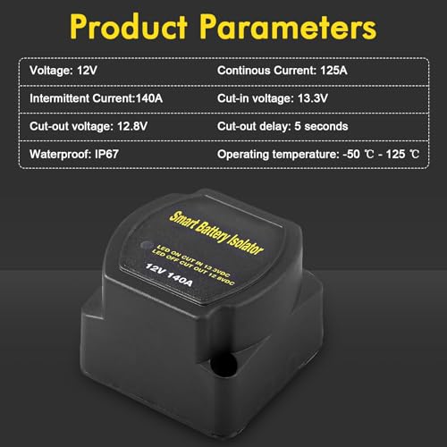 Weit verbreitet: Dieses Trennrelais 12v zweitbatterie ist weit verbreitet und eignet sich für die meisten 12-V-Autos, Wohnwagen, SUVs, LKWs, Wohnmobile, SUVs, Wohnmobile, Geländefahrzeuge, UTVs, ATVs, UTVs, Boote usw. • Zwei Batterien laden: Mit diesem Split-Charge-Relais-Kit können Sie zwei Batterien gleichzeitig laden. Wenn der Motor startet, wird die Hauptbatterie automatisch aufgeladen. Wenn die Spannung der Hauptbatterie 13,3 Volt erreicht, schaltet das Relais die Hilfsbatterie zu und die beiden Batterien werden parallel geschaltet, sodass die beiden Batterien gleichzeitig geladen werden können, ohne die Stromversorgung der elektrischen Ausrüstung des Fahrzeugs zu beeinträchtigen. • Schützen Sie die Hauptbatterie: Dieser Doppelbatterie-Trennschalter 12 V schützt die Hauptbatterie davor, dass ihnen der Strom ausgeht. Wenn der Motor abgestellt ist, verbraucht die elektrische Ausrüstung des Fahrzeugs langsam Strom. Wenn die Spannung der Hauptbatterie auf 12,8 V sinkt, trennt der Batterietrennschalter die Hauptbatterie, sodass die Hauptbatterie nicht entladen wird, wenn die Sekundärbatterie entladen wird, um die elektrischen Geräte mit Strom zu versorgen. • Wasserdicht und langlebig: Dieses spannungsempfindliche Relais bietet zuverlässige Leistung auch in rauen Umgebungen. Dieser Batterieisolator hat einen weiten Betriebstemperaturbereich (-50 Grad Celsius – 125 Grad Celsius), ist wasserdicht, stoßfest, sicher und langlebig. • Einfach zu installieren: Dieses Trennrelais 12v enthält einen vollständigen Satz Installationszubehör, es ist kein Kauf von zusätzlichem Zubehör erforderlich und die Installation ist einfach. Wenn Sie Fragen haben, senden Sie uns bitte eine E-Mail. Wir werden Ihr Problem innerhalb von 24 Stunden lösen.