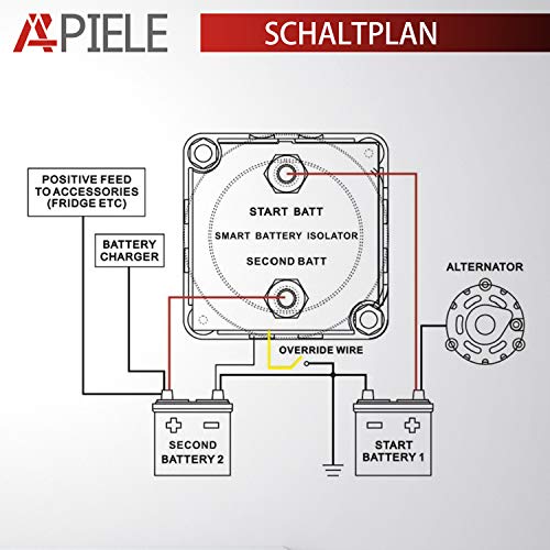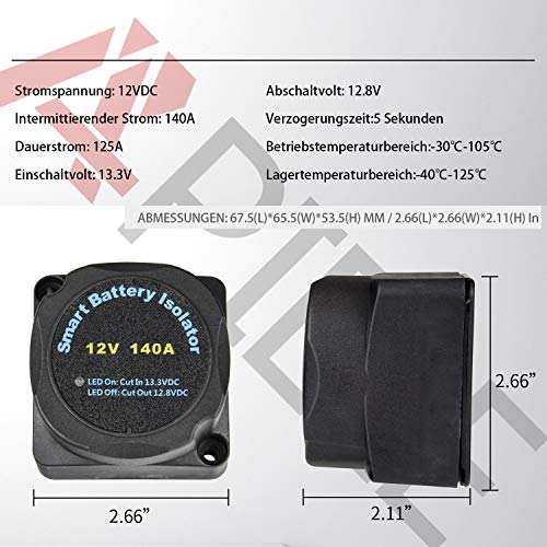 【VSR】 Ein spannungsempfindliches Relais (VSR) ist der beste Weg, um sicherzustellen, dass Sie Ihr Fahrzeug mit zwei Batterien immer starten können. Keine Spannungsabfälle im Vergleich zu Batterietrenndioden (0,6 V). Geeignet für Car HiFi, Tuning, PKW, Busse, Boote, Caravan und Camping, Wohnmobil, Solaranwendungen, CarHiFi etc. • 【Operation】 Kombiniert automatisch zwei Akkus beim Laden und isoliert die beiden Akkus, wenn nicht geladen wird. Sobald Ihre Haupt-Starterbatterie ausreichend geladen ist, wird auch die zweite Batterie geladen. Beim Auspacken macht das Relais einen wertigen Eindruck. Die Technik ist im GfK-Gehäuse komplett vergossen, nur di benötigten Anschlüsse und Kabel schauen auf der Unterseite heraus. Es schaltet auch zuverlässig bei 12,8 und 13,3 V. • 【LED-Anzeige】 Einfache Installation: stabile Funktionen und hohe Zuverlässigkeit. Optionen für die Oberflächen- oder Schalttafelmontage bieten Flexibilität bei der Installation. Perfekte Größe für einfache Installation ohne Änderungen. • 【Hohe Qualität】Hochwertige Materialien: Hergestellt aus hochwertigem glasfaserverstärktem Nylon, leicht, verschleißfest, korrosionsbeständig, formstabil, hochtemperaturbeständig, ausgezeichnete Wasserbeständigkeit, bestimmte Härte, Kollision ist nicht leicht zu beschädigen. • 【Service】 100% neue hohe Qualität. Wenn Sie Fragen zu unseren Produkten haben, kontaktieren Sie uns bitte und wir werden uns innerhalb von 24 Stunden bei Ihnen melden. Hilfe >> Benötigen Sie weitere Hilfe >> Kontaktieren Sie uns oben auf der Amazon-Seite und wählen Sie Chat Customer Service.