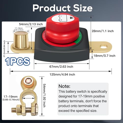 【Upgraded 180° Adjustable Battery Disconnect Switch 12V】: Dieser Batterietrennschalter für DC 12 – 48V Systeme mit einer 180° frei einstellbaren Position wird verwendet, um das elektrische System zu isolieren und zu schützen und die Batterie zu trennen, wenn das Fahrzeug nicht in Gebrauch ist, was dazu beiträgt, dass die Batterie nicht entladen wird und die Lebensdauer der Batterie verlängert. • 【Quick&Direct Fit】: Keine zusätzlichen Teile erforderlich – Direkte Installation ohne zusätzliche Kabel oder Laschen! Dieser Batterietrennschalter wird direkt an den oberen Pol Ihrer Batterie angeschlossen, so dass es einfach ist, den Strom zu unterbrechen und Ihr elektrisches System zu sichern, wann immer es nötig ist. Geeignet für jeden, vom Anfänger bis zum Heimwerker. • 【Enhanced Safety】: Durch die Verwendung dieses Batterietrennschalters wird die Batterie vollständig isoliert, wodurch ein elektrischer Kontakt oder Stromfluss verhindert wird, der potenzielle elektrische Fehler und Sicherheitsgefahren verursachen könnte. Dies bietet zusätzliche Sicherheit für das Wartungspersonal und reduziert effektiv das Risiko von elektrischen Ausfällen und gewährleistet einen sicheren Betrieb. • 【Built to Last and Safe Design】: Hergestellt aus hochwertigem ABS-Kunststoff mit Kupferanschlüssen, ist dieser Batterieabschalter für den dauerhaften Einsatz konzipiert. Er ist korrosionsbeständig und hilft, Ihre Batterie vor versehentlichen Kurzschlüssen zu schützen, so dass Sie sich im täglichen Gebrauch darauf verlassen können. • 【Wide Application】: Kann allein stehen oder zusammen mit anderen Schaltern abgeschlossen werden. Es ist weit verbreitet für Auto, Marine, Boot, RV, Camper, Travel Trailer, LKW, ATV, UTV, Batterie Banken und andere elektrische Geräte Schalter verwendet.