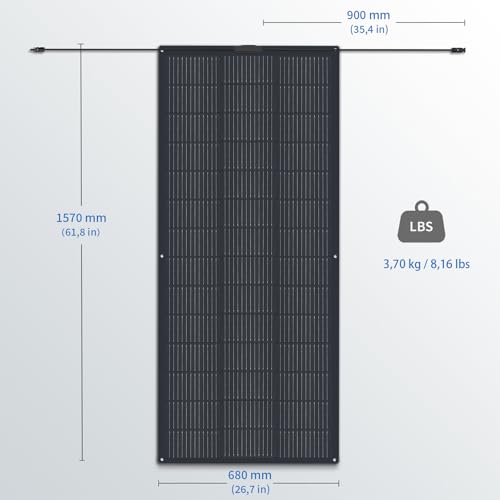 【Hocheffizientes Solarpanel】Das Panel wird durch Solarzellen mit einer Umwandlungsrate von 23% hergestellt. 1/2 Schnitt Solarzelle Design, reduzierte interne Verluste, geringeres Risiko von Hot Spots, längere Lebensdauer. • 【Kleiner und leichter】Im Vergleich zu herkömmlichen Glasrahmen-Solarmodulen ist das Gewicht des flexiblen Solarmoduls um 70-80 % geringer. Das geringe Gewicht macht den Transport und die Installation viel einfacher. Die Solarmodule können auch auf leicht gekrümmten Oberflächen installiert werden. • 【Zuverlässiger Stromausfall】Alle unsere Solarmodule werden aus monokristallinen PERC-Solarzellen der Klasse A+ hergestellt und wir versprechen eine positive Toleranz bei der Nennleistung. Das Panel ist mit einer IP65-Anschlussdose und Standard-MC4-Steckern ausgestattet. Dies schützt das Panel vor rauen Umgebungen. • 【Vielfältige Anwendung】Unser schwarzes, flexibles Solarpanel wurde für netzunabhängige Stromversorgungssysteme entwickelt und eignet sich für Balkonkraftwerke, Wohnwagen, Wohnmobile, Boote, Gärten, Dächer und mehr. Perfekt zum Laden einzelner 12-Volt-Batterien oder mehrere Panels können in Reihe geschaltet werden, um 24/48-Volt-Batterien zu laden oder für netzbetriebene Anwendungen. • 【Garantie】12 Monate Garantie auf Verarbeitung und Material und schneller professioneller Kundenservice.