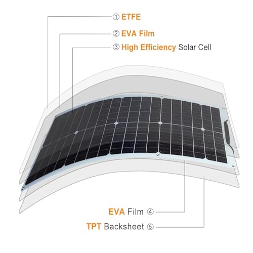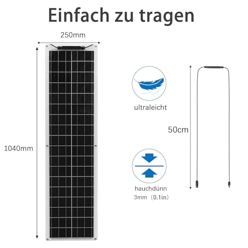 【Hochwertige monokristalline Solarmodule】 Unser 50W Solarmodul besteht aus A-Grade monokristallinen Solarzellen mit einem beeindruckenden Wirkungsgrad von bis zu 22,9%. Dank der hohen Umwandlungseffizienz erzeugt dieses Solarmodul mehr Strom bei gleicher Größe – perfekt für alle, die hohe Leistung auf kleinem Raum suchen • 【Flexibel und vielseitig einsetzbar】 Das flexible Solarpanel lässt sich leicht biegen und kehrt automatisch in seine ursprüngliche Form zurück. Es eignet sich ideal für die Montage auf Wohnmobilen, Booten, Gartenhäusern, Zelten, Autos, LKWs, Anhängern oder anderen unebenen Oberflächen. Egal, ob Sie Camping, Outdoor-Aktivitäten oder eine nachhaltige Energieversorgung planen – dieses Solarmodul ist die perfekte Wahl • 【Leicht und portabel】 Mit nur einem Viertel des Gewichts eines herkömmlichen 50W-Solarmoduls und einer Dicke von weniger als 3 mm ist dieses flexible Solarmodul extrem leicht und einfach zu transportieren. Perfekt für alle, die unterwegs sind und eine zuverlässige Energiequelle benötigen • 【Einfache Installation】 Das 50W Solarpanel ist mit vorgebohrten Befestigungslöchern ausgestattet, die eine stabile Montage ermöglichen. Es kann einfach mit Silikon, doppelseitigem Klebeband, Kabelbindern oder Klettverschluss befestigt werden. Die Installation ist schnell und unkompliziert – selbst für Laien • [Photovoltaikanlagen Zubehör]: Solarmodul mit 1 x 12V/24V 10A Solarladeregler; 2 x MC4 Stecker, mit 2 x 3 Meter Solarkabel Verlängerung; 3 Meter Krokodilklemmenkabel(Solarladeregler Batterie Verbindungskabel) , zum Laden von Blei-Säure- und Lithium-Batterien. Die Kabel sind alle wasserdicht und haben eine bessere Qualität und Länge als ihre Gegenstücke