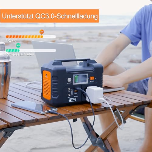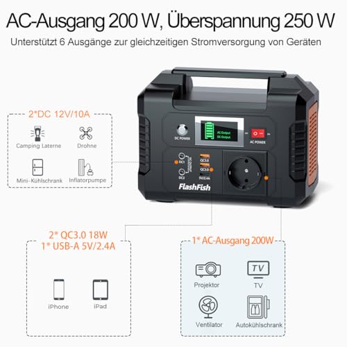 POWERSTATION 200W – Diese mobile powerstation verfügt über 2x126W DC-Ausgang, 2x18W QC3.0 USB-A-Anschluss, 1x5V/2.4A USB-A-Anschlüsse, 1x200W AC-Ausgang für schnelles Aufladen und kann bis zu 6 Geräte (Die Gesamtleistung darf 200W nicht überschreiten), kompatibel mit 90 % der Produkte und konzipiert für Outdoor-Abenteuer und Notstromausfälle in Gebäuden. • POWERBANK MIT STECKDOSE 3 LADEMODEN – Die tragbare powerstation 200W verfügt über 3 Lademodi: 4.9 Stunden über das Netzteil, 1.5 Stunden über das 12V-Autoladegerät und 5.1 Stunden über das 60W-Solarpanel FLASHFISH. Sie brauchen sich keine Gedanken über das Aufladen zu machen, wenn Sie draußen auf Abenteuern oder beim Camping sind. • SOLARPANEL 60W 18V – Solarpanel faltbar ausgestattet mit 1xPD 45W Type-C-Ausgänge und 1x 18W QC3.0 USB-A-Ausgangsanschluss, 1x18V DC-Ausgang. Tragbares solarpanel faltbar laden Sie mehrere kleine Geräte gleichzeitig auf, bereiten Sie sich darauf vor Smartphones und Tablets, GPS, Digitalkameras usw. Ideal geeignet für das Leben im Freien und sogar unerwartete Stromausfälle. • INTELLIGENTES LADEGERÄT – 18V 60W faltbares solarpanel eingebauter fortschrittlicher Chip, liefert eine Ladeeffizienz, die 30% schneller ist als bei herkömmlichen Controllern. Solarpanel faltbar Identifiziert Ihr Gerät intelligent und maximiert seine Ladegeschwindigkeit, während es Ihre Geräte vor Überladung und Überlastung schützt. Der Ladestrom wird überwacht und automatisch an die Sonneneinstrahlung angepasst. • INTELLIGENTES SCHUTZSYSTEM – Die 200W solar powerstation ist CE, PSE, FCC, MSDS, RoHS und UN 38.3 sicherheitszertifiziert. Es ist mit einem BMS (Battery Management System) ausgestattet, das die Sicherheit durch Überstromschutz, Überspannungsschutz, Ausgangsunterspannungsschutz, Überhitzungsschutz und Kurzschlussschutz gewährleistet.