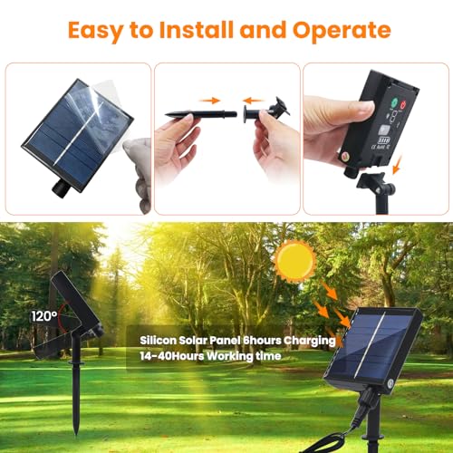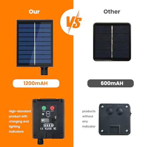 LEISTUNGSSTARK: 1200mAh Solarpanel mit hoher Effizienz, 6 Stunden Ladezeit und 14-40 Stunden Betriebszeit für optimale Energieversorgung • FLEXIBEL EINSTELLBAR: 120-Grad-Schwenkbereich ermöglicht präzise Ausrichtung zur Sonne für maximale Energiegewinnung • EINFACHE MONTAGE: Werkzeuglose Installation durch praktisches Stecksystem, inklusive Befestigungsstab für Bodenmontage • INTELLIGENTE ANZEIGE: Integrierte LED-Statusanzeigen für Ladezustand und Betriebsmodus zur einfachen Überwachung • ROBUSTE KONSTRUKTION: Wetterfestes Gehäuse schützt die Elektronik, ideal für den ganzjährigen Außeneinsatz