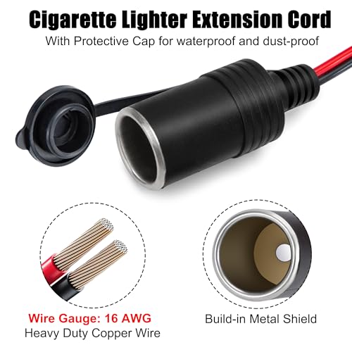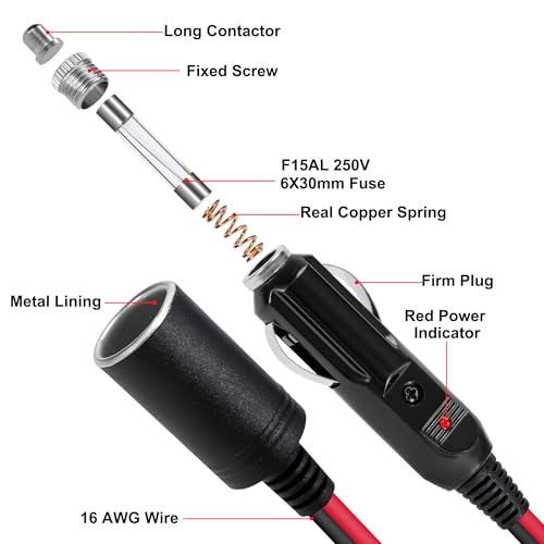 Zigarettenanzünder Verlängerungskabel: 12V 16AWG kfz Verlängerungskabel, Kabellänge 2 m. mit Zigarettenanzünder Stecker und Buchse, einfache Verlängerung der elektrischen Verbindungen im Auto • Premium Material: Auto Zigarettenanzünder Stecker aus Bakelit, hitze und korrosionsbeständig, robustes 16 AWG reines Kupferkabel mit verdickter PVC-Schutzschicht, hervorragende Isolierung, beliebig biegbar, nicht leicht zu knacken • Überlastschutz: Integrierte 15A Sicherung des Zigarettenanzünder steckers für Überlast und Kurzschlussschutz. Stellen Sie sicher, dass sich der Stecker nicht erwärmt und das Autozubehör beschädigt. Buchse mit wasserdichter Abdeckung, wasserdicht und staubdicht • Einfach zu bedienen: Das Verlängerungskabel ist Plug-and-Play-fähig und einfach zu verwenden, ohne dass eine Installation erforderlich ist. Mit der roten Betriebsanzeige lässt sich der Verbindungsstatus im Dunkeln oder nachts leicht überprüfen. Verbesserte rutschfeste Blattfedern sorgen für eine dichte Verbindung • Breite Anwendung: Geeignet für alle 12-24V Autogeräte mit Zigarettenanzünderstecker, wie Reifenfüller, Auto-Fernseher, Auto-Kühlschränke, Staubsauger, Wechselrichter, Auto-Kaffeemaschinen, Luftreiniger oder ein anderes Auto-Set