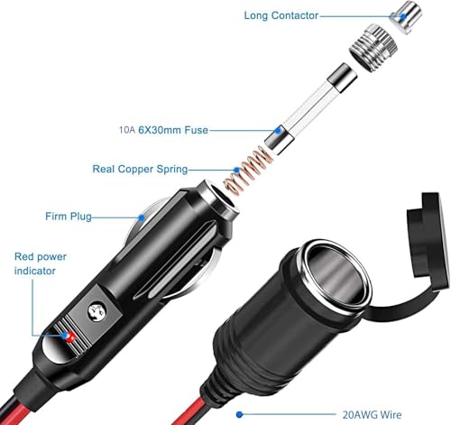 【Verlängerungskabel】 Das Verlängerungskabel des Zigarettenanzünders ist 4 meter lang. Nennquerschnitt des inneren Kerns: 0,52mm² (20AWG). Sie können die elektrischen Anschlüsse im Auto problemlos verlängern. • 【Garantierte Sicherheit】 Das Verlängerungskabel ist mit einer austauschbaren 10A Sicherung und einer roten LED Anzeige ausgestattet, um Überstrom und Kurzschluss wirksam zu verhindern. Bieten Sie umfassenden Schutz für Ihre Geräte. • 【Hohe Qualität】 Das Zigarettenanzünderkabel besteht aus hochwertigem Kupferkerndraht mit Doppelschicht PVC und guter Technologie, hoher Temperaturbeständigkeit und Schmelzbeständigkeit und kann mehr als 4000 Mal gefaltet werden. • 【Wasserdicht und staubdicht】 Die Schutzhüllen sind wasserdicht und staubdicht. Wenn Sie sie nicht täglich verwenden müssen, können Sie sie leicht falten und die Abdeckung befestigen, um das Eindringen von Staub zu verhindern. • 【Breite Anwendung】 Dieses Netzkabel für Zigarettenanzünder eignet sich für Autos, Wohnmobile, LKWs oder Reifenpumpen, Heizdecken, tragbare Fernseher, tragbare Kühlschränke, Lüfter, Lampen, Autoluftreiniger und andere 12V / 24V Autosätze.