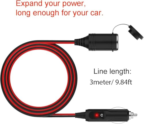 【Verlängerungskabel】 Das Verlängerungskabel des Zigarettenanzünders ist 3 meter lang. Nennquerschnitt des inneren Kerns: 0,52mm² (20AWG). Sie können die elektrischen Anschlüsse im Auto problemlos verlängern. • 【Garantierte Sicherheit】 Das Verlängerungskabel ist mit einer austauschbaren 10A Sicherung und einer roten LED Anzeige ausgestattet, um Überstrom und Kurzschluss wirksam zu verhindern. Bieten Sie umfassenden Schutz für Ihre Geräte. • 【Hohe Qualität】 Das Zigarettenanzünderkabel besteht aus hochwertigem Kupferkerndraht mit Doppelschicht PVC und guter Technologie, hoher Temperaturbeständigkeit und Schmelzbeständigkeit und kann mehr als 4000 Mal gefaltet werden. • 【Wasserdicht und staubdicht】 Die Schutzhüllen sind wasserdicht und staubdicht. Wenn Sie sie nicht täglich verwenden müssen, können Sie sie leicht falten und die Abdeckung befestigen, um das Eindringen von Staub zu verhindern. • 【Breite Anwendung】 Dieses Netzkabel für Zigarettenanzünder eignet sich für Autos, Wohnmobile, LKWs oder Reifenpumpen, Heizdecken, tragbare Fernseher, tragbare Kühlschränke, Lüfter, Lampen, Autoluftreiniger und andere 12V / 24V Autosätze.