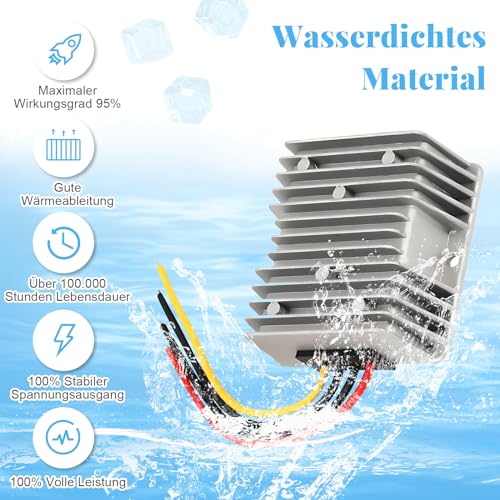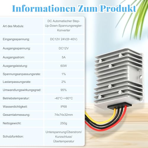 【Parameter】DC 8-40V (9V 12V 24V 36V) Eingang; DC 12V-Ausgang; 5A maximaler Ausgangsstrom; 60W Ausgangsleistung; IP68 wasserdicht. • 【Merkmale】Das Step-Up-Down-Leistungsmodul verfügt über einen hochintegrierten Chip. Synchrongleichrichtungstechnologie mit einem Umwandlungswirkungsgrad von über 95 %; Stabile Leistung und geringe Hitze. • 【Multi-Schutz】Dieser Spannungsstabilisator verfügt über einen Ausgangsüberstromschutz, einen Ausgangskurzschlussschutz, einen Eingangsunterspannungsschutz und einen Chip-Hochtemperaturschutz. Nimmt die Vergusstechnologie an, die sich durch Wasserdichtigkeit, Staubdichtigkeit, Feuchtigkeitsbeständigkeit und Stoßfestigkeit auszeichnet und in verschiedenen Situationen wie im Auto, im Freien, unter der Erde usw. verwendet werden kann. • 【Anwendung】Kompaktes Design und geringe Größe, bietet ein breites Anwendungsspektrum, z. B. Autoalarmanlage, Radio, Gegensprechanlage, Motoren, Audio, Navigator, Monitor, LED-Autoanzeige usw. • 【Hinweis】Einfach anzuschließende Drähte, Eingang: rot (+) schwarz (-), Ausgang: gelb (+) schwarz (-); Bitte schließen Sie die Kabel richtig an, sonst wird es beschädigt. Und wenn die Last Ihres Geräts nahe an der MAX POWER liegt, wählen Sie einen Wechselrichter mit höherer Leistung, da MAX POWER nicht über längere Zeiträume verwendet werden kann.