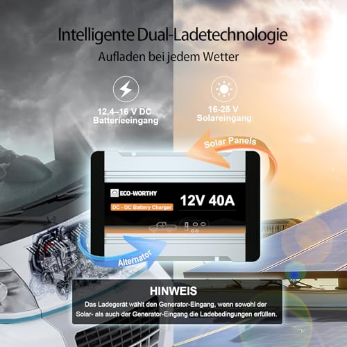 【EFFIZIENTES LADEN MIT DOPPELTEM EINGANG】: Das ECO-WORTHY DC-DC-Ladegerät 12V 40A verfügt über einzigartige Ladeoptionen. Dieses Batterieladegerät mit mehreren Ladestufen und zwei Eingängen kann Freizeitbatterien laden, indem es an die Starterbatterie einer Fahrzeuglichtmaschine oder an ein Solarpanel angeschlossen wird. Sorgt für das ordnungsgemäße Laden von Blei-Säure-, Lithium- und Kalziumbatterien. • 【MPPT-LADUNG mit 99 % Effizienz】Ladebooster für Wohnmobilen, Wohnwagen mit IP65-Wasserdichtigkeit. Das intelligente MPPT-Solarsteuerungssystem verfügt über eine Ladespeicherfunktion, die entsprechend den Ladegewohnheiten des Benutzers aufzeichnen kann. • 【Verschiedene Schutzfunktionen für höchste Sicherheit】 Bietet Überspannungsschutz, Übertemperaturschutz und Verpolungsschutz, um die Betriebssicherheit zu gewährleisten. Es isoliert außerdem den Ein- und Ausgang, um Fehler bei der Spannungsübertragung zu verhindern und das Laden der Hausbatterie zu beeinträchtigen. • 【1-WEGE-LADUNG】 Durch die Hinzufügung einer Stater-Batterie und einer Isolation der Freizeitbatterie wird eine höhere Sicherheitsleistung erzielt. Um den Stromverlust der Freizeitbatterie zu verhindern, haben wir eine Einwegladung hinzugefügt, um ein Zurückladen der Lebensbatterie und einen Stromverbrauch zu verhindern. • 【EINFACHE BEDIENUNG】 Es gibt Verkabelungen für Solarpanel, Lichtmaschine und Batterie. Eine normale Ladeverkabelung wird durch Licht angezeigt, um besser feststellen zu können, ob die Verbindung abnormal ist.