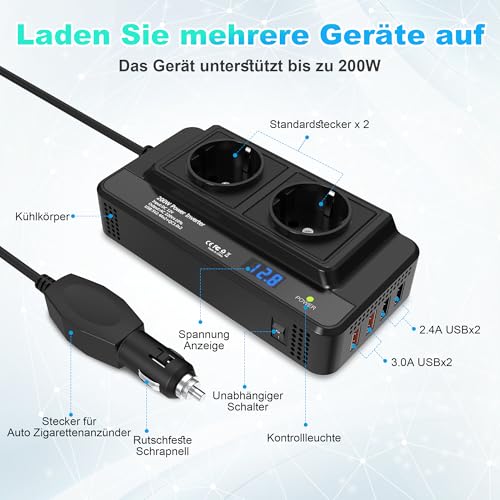 【Laden mit Mehrfachschutz】: Dieser Kfz Konverter besteht aus isoliertem, flammhemmendem ABS-Material. Der Kfz Wechselrichter mit Hochspannungsschutz ist sowohl für den Kfz Adapter als auch für Ihr Gerät sicher. Die eingebaute Sicherung bietet Ihrem Gerät umfassenden Schutz vor Kurzschluss, Unterspannung, Überladung, Überspannung, Überlastung und Übertemperatur. • 【Vorteile des Ladegeräts】: 200W Auto Wechselrichter mit 2 AC Steckdosen, 2 2,4A USB Ladeanschlüssen, 2 3,0A USB Ladeanschlüssen, 72cm Kabel, genug, um überall im Auto verwendet zu werden. Ein eingebauter intelligenter Lüfter hilft dem Autoadapter, die Hitze zu reduzieren und Engpässe zu vermeiden. • 【Kompakt und tragbar】: Der Wechselrichter ist leicht und kompakt; das robuste Metallgehäuse bietet längeren Schutz vor Stürzen und Stößen. Dank des intelligenten Lüftersystems arbeitet der Onboard-Wechselrichter äußerst leise. Das einzigartige Design ist wissenschaftlicher und kompakter, was die Benutzerfreundlichkeit und Tragbarkeit des Fahrzeugwechselrichters erheblich verbessert. • 【Breites Einsatzspektrum】: Der Auto Wechselrichter kann mit einem 12V Zigarettenanzünder oder einer Batterie betrieben werden. Jeder, der in einem Auto, LKW, Wohnmobil oder Jetski unterwegs ist, kann einen Wechselrichter nutzen. Dank seines Zigarettenanzündersteckers kann der Wechselrichter an nahezu jedes Fahrzeug angeschlossen werden und eignet sich somit perfekt für den Urlaub, Roadtrip und Camping. • 【Bitte beachten Sie】: Dieser Wechselrichter kann nur in 12V Autos verwendet werden. Dieses Produkt funktioniert nicht, wenn es in einem 24V Auto verwendet wird. Warten Sie nach dem Anschließen des Zigarettenanzünders 3 Sekunden, bis die Kontrollleuchte aufleuchtet. Anschließend können Sie das gewünschte Gerät anschließen. Bitte beachten Sie, dass das Gerät nicht zu stark belastet werden darf, da der Wechselrichter sonst nicht funktioniert.